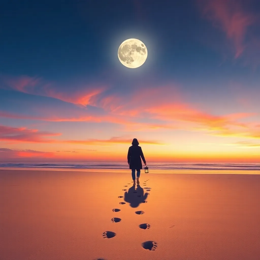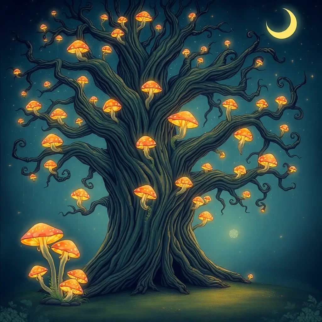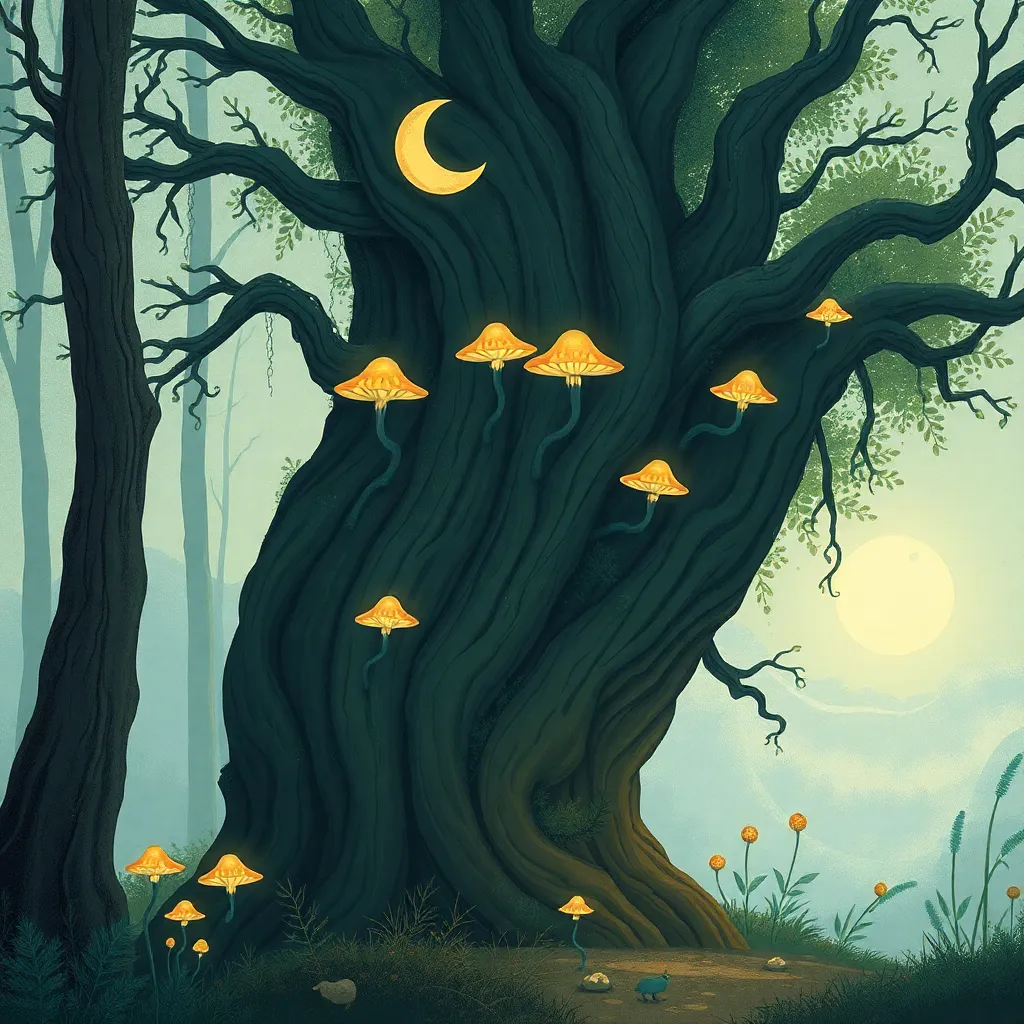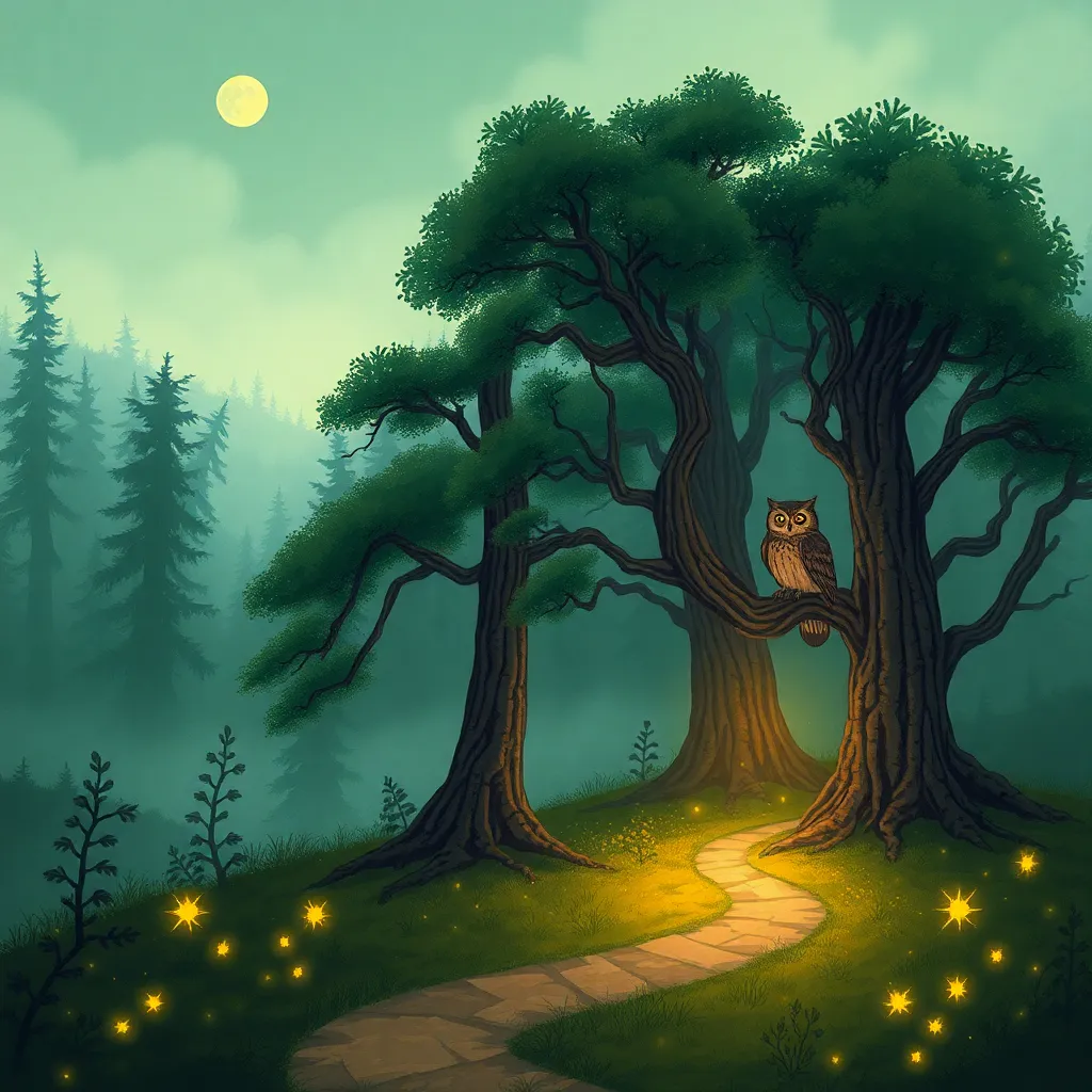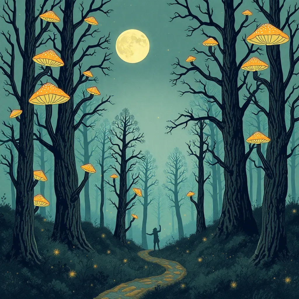 Create a whimsical illustration of a mystical forest at sunset, with towering trees, glowing mushrooms, and a winding path that disappears into the mist. Incorporate subtle magical sparks and a crescent moon peeking through the canopy. The atmosphere should be dreamy and enchanting, inviting the viewer to step into the scene.