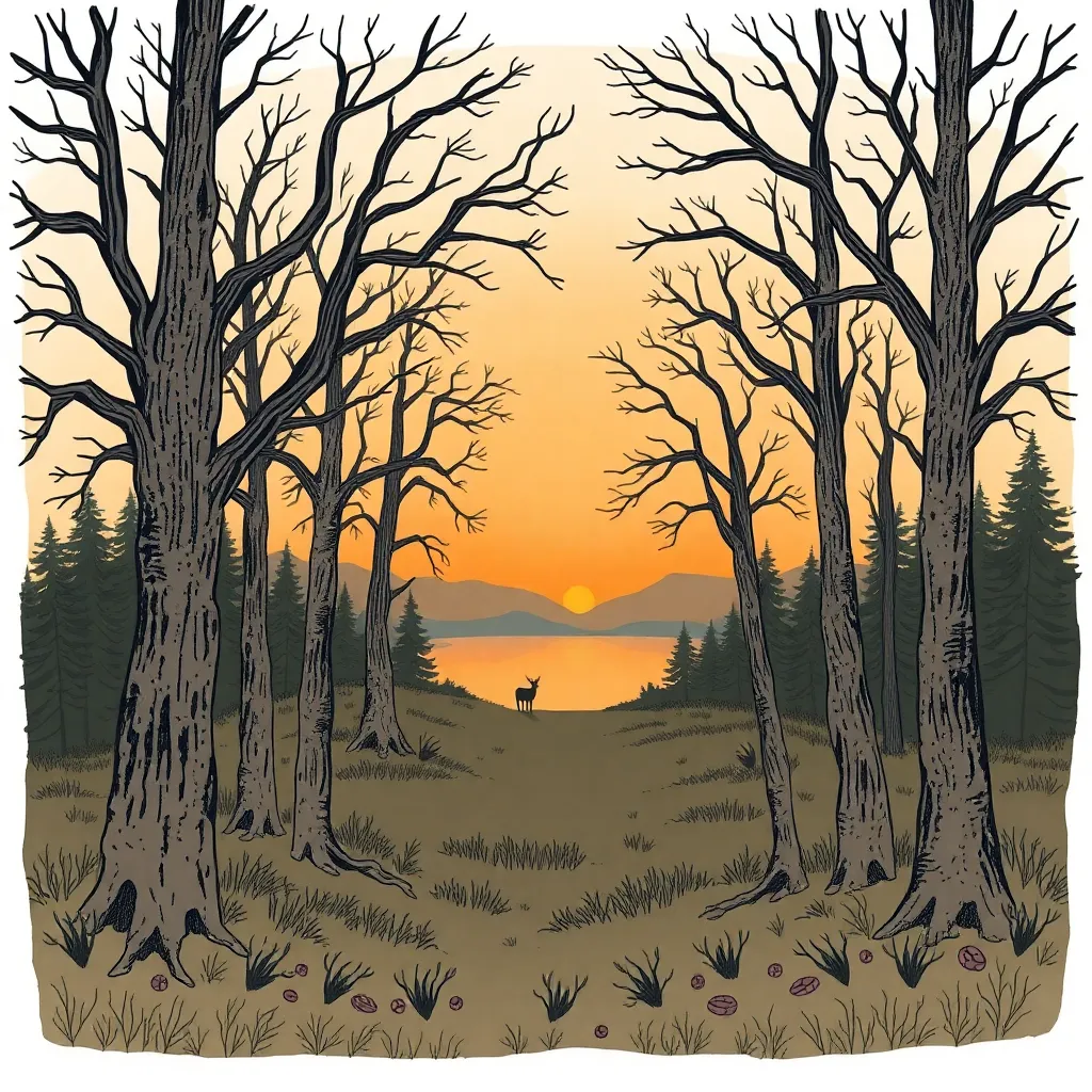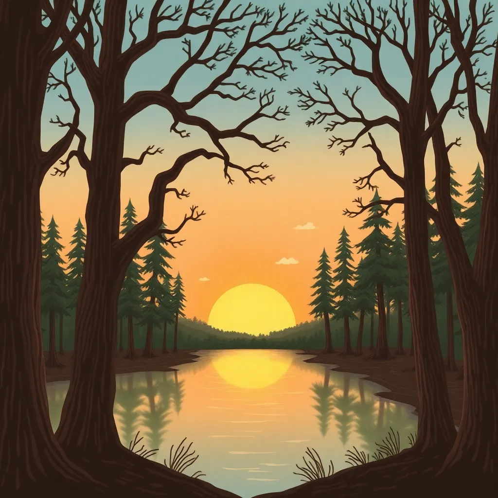 Create a whimsical, hand-drawn illustration of a serene forest at sunset. Incorporate towering trees with gnarled branches, a tranquil lake reflecting the warm colors of the sky, and a few wispy clouds drifting lazily across the horizon. Use earthy tones and delicate lines to evoke a sense of wonder.