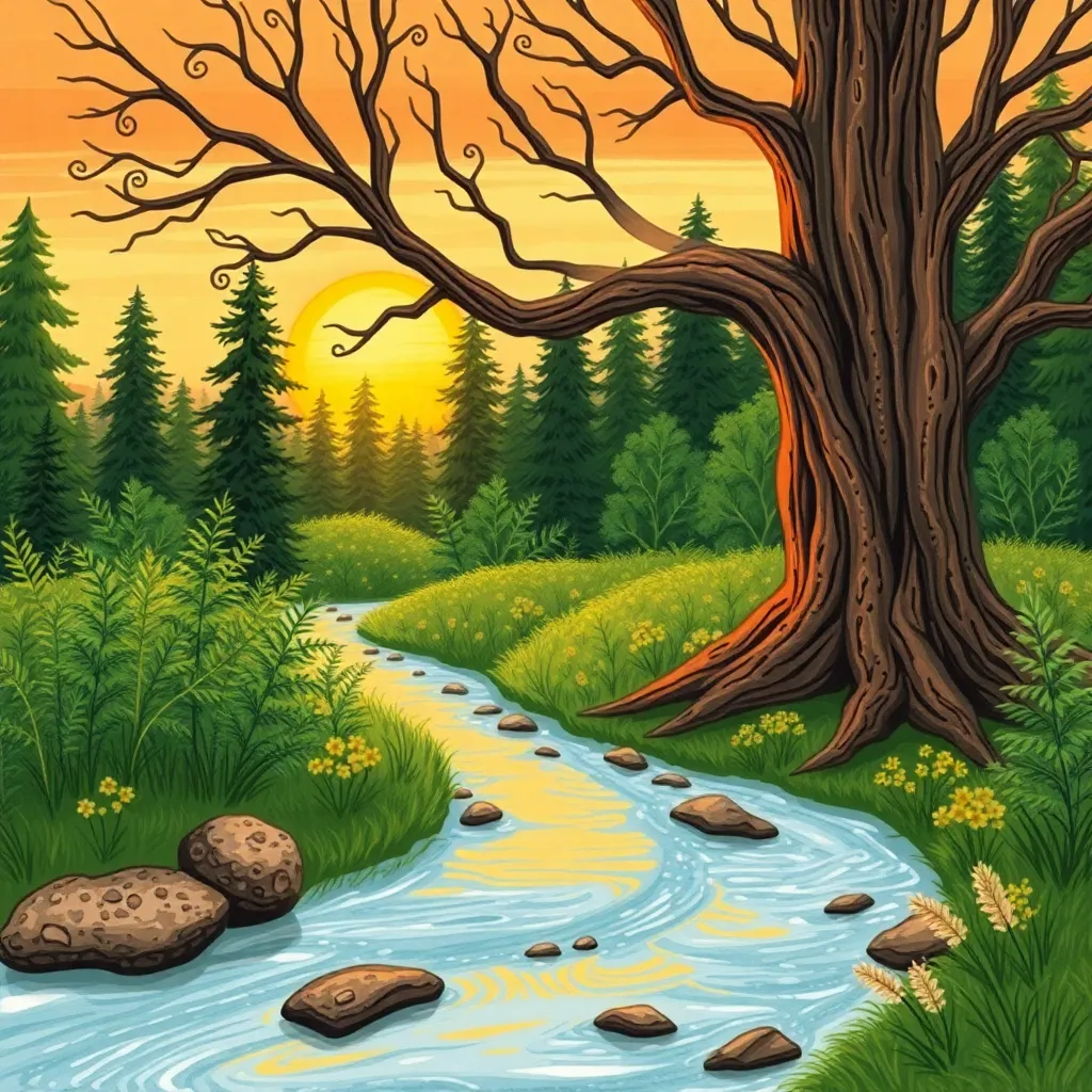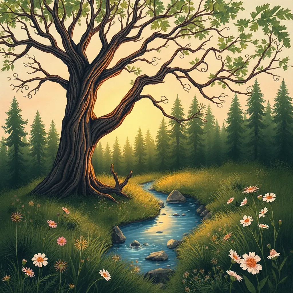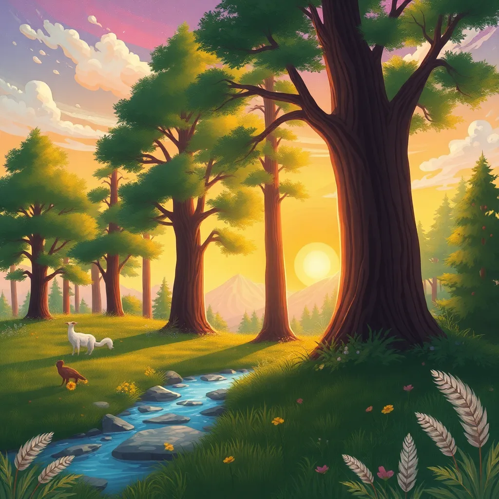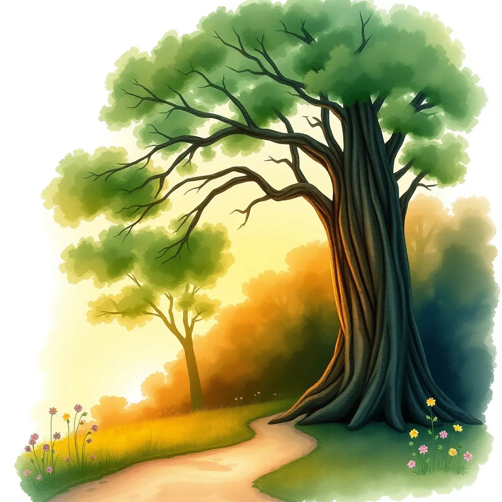 Create a whimsical illustration of a serene forest at sunset, featuring a towering tree with a wispy canopy, a winding path, and a few scattered wildflowers. Incorporate soft, warm lighting and subtle shadows to evoke a sense of peace and tranquility. The style should be reminiscent of a classic watercolor painting.