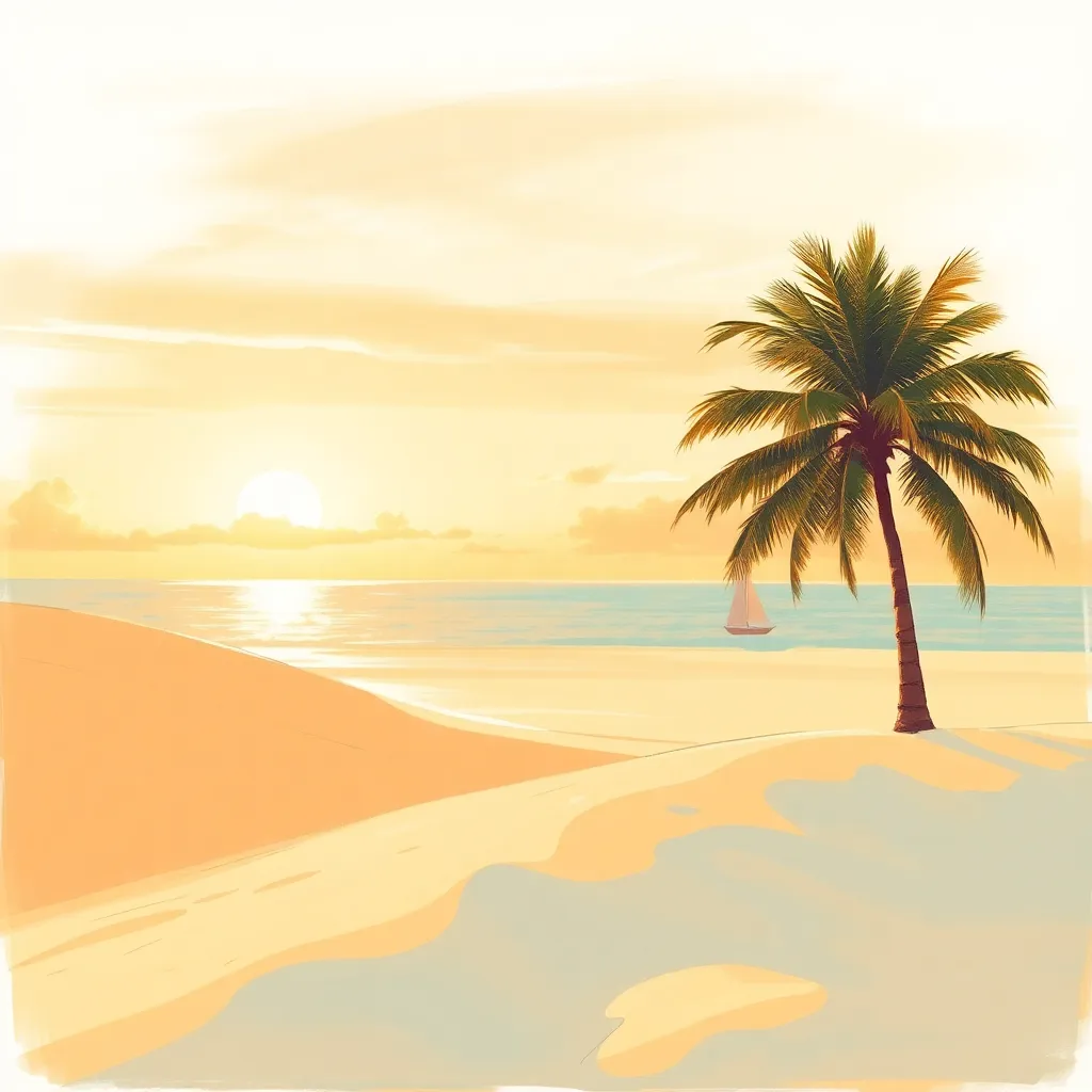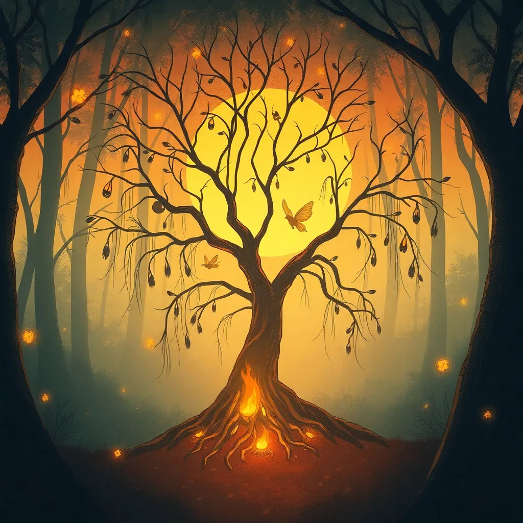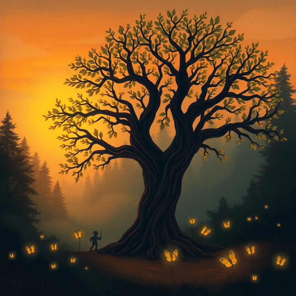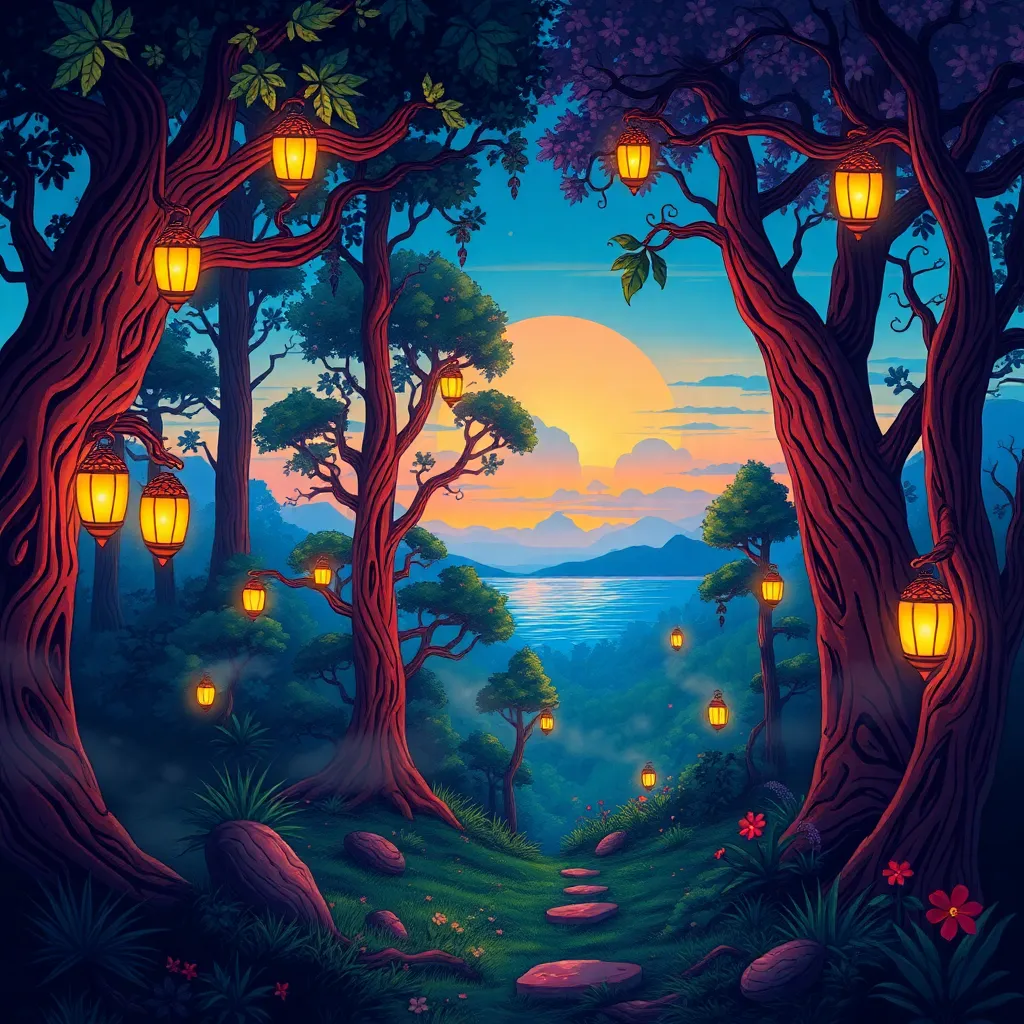 Create a whimsical illustration of a serene forest at sunset, featuring a towering tree with a wispy canopy, a winding path, and a few scattered wildflowers. Incorporate soft, warm lighting and subtle shadows to evoke a sense of peace and tranquility. The style should be reminiscent of a classic watercolor painting.