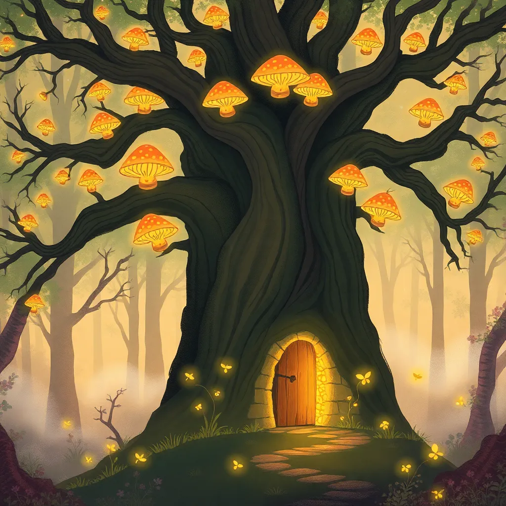 Create a whimsical illustration of a mystical forest at dusk, with towering trees, glowing mushrooms, and a full moon rising above the treetops. Incorporate subtle wisps of fog and a few fireflies twinkling like tiny stars. The atmosphere should be dreamy and enchanting, as if magic is alive in this forest.