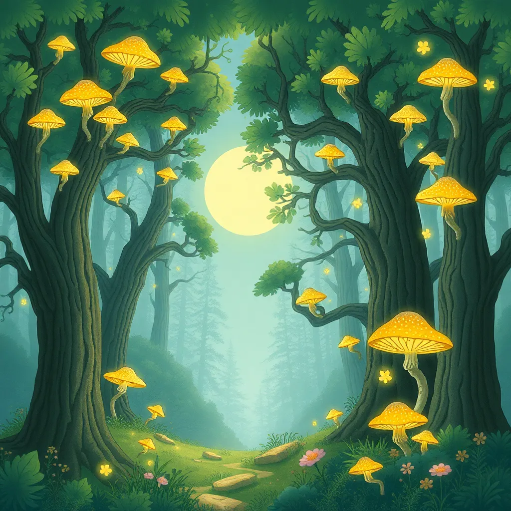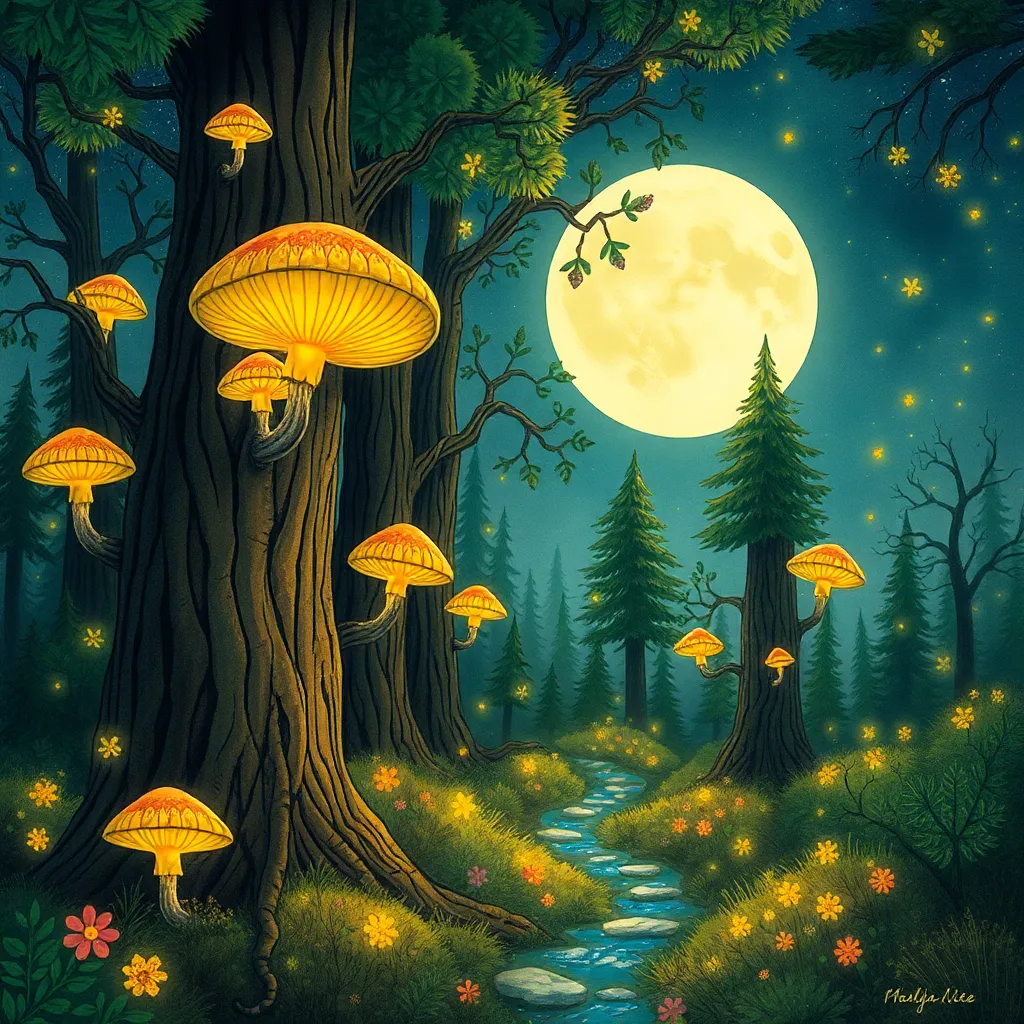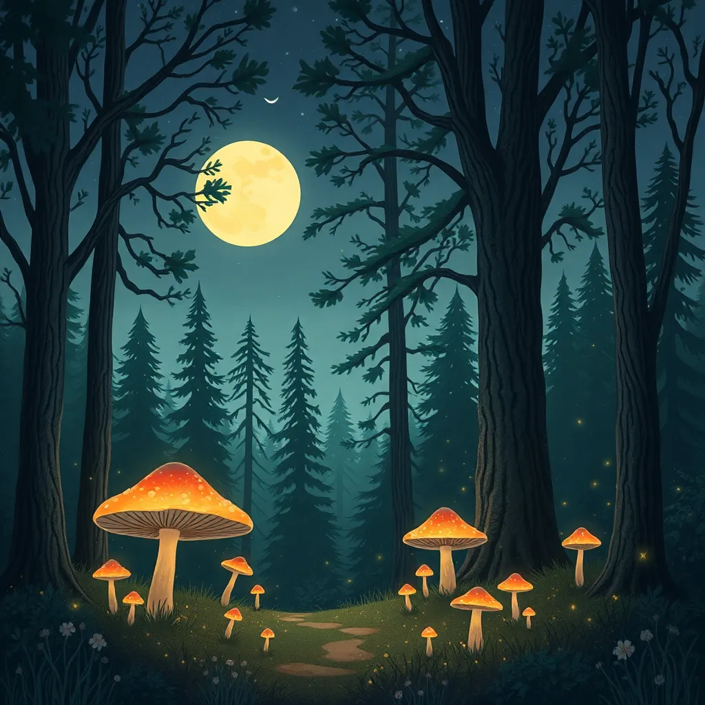 Create a whimsical illustration of a fantastical forest, featuring towering trees with glowing mushrooms, sparkling fireflies, and a full moon shining down. Incorporate intricate details and textures to bring this enchanting scene to life. Use a color palette of soft greens, blues, and yellows to evoke a sense of wonder.