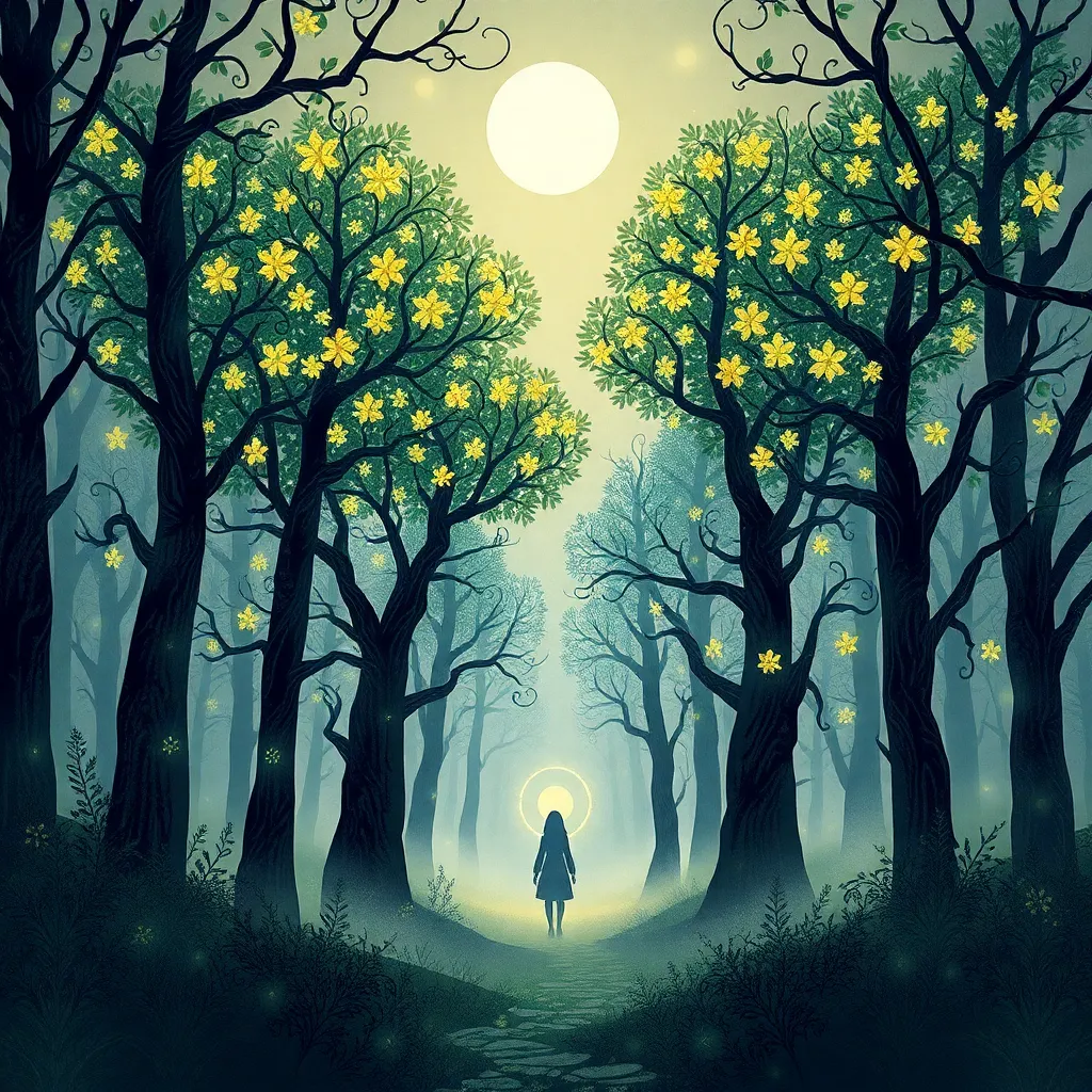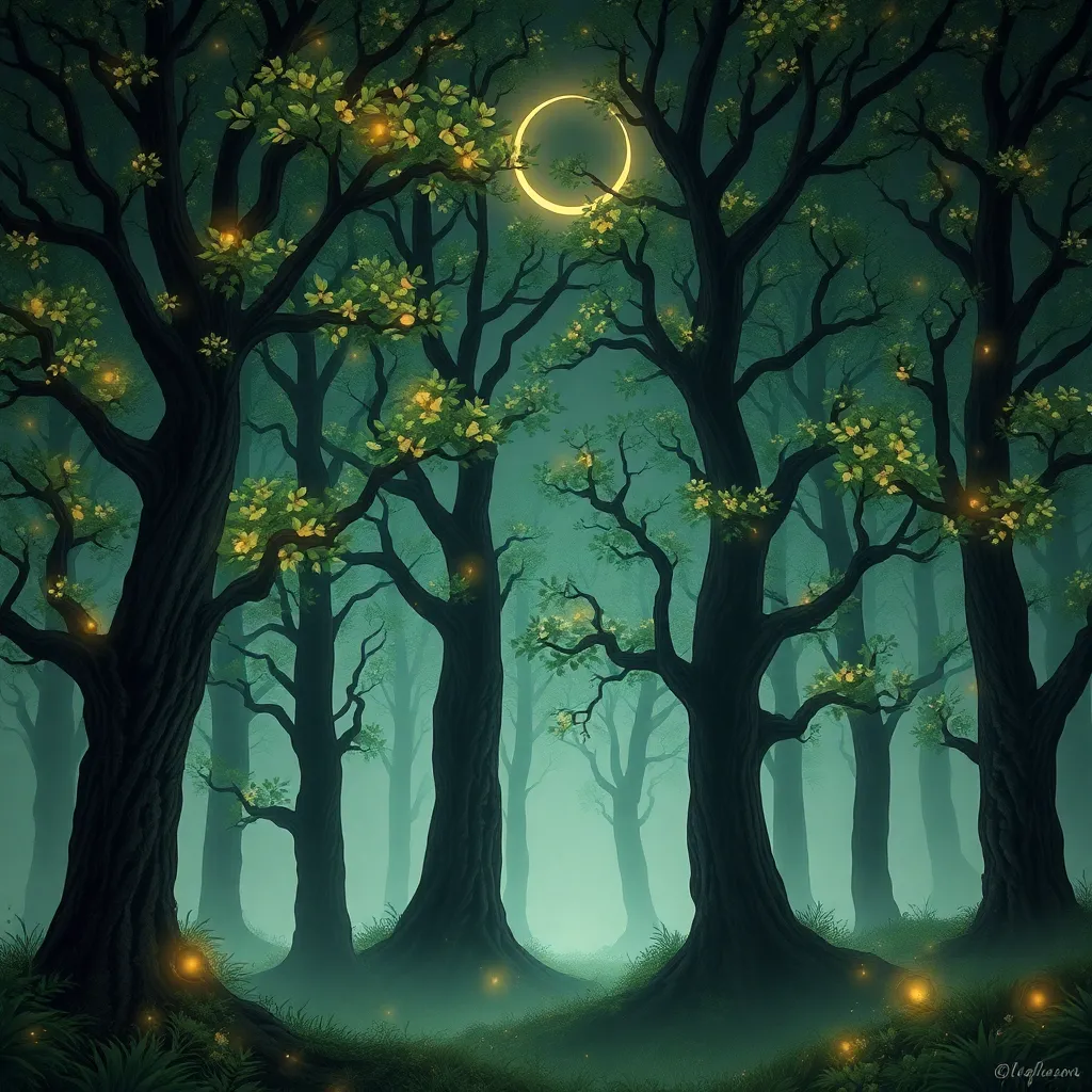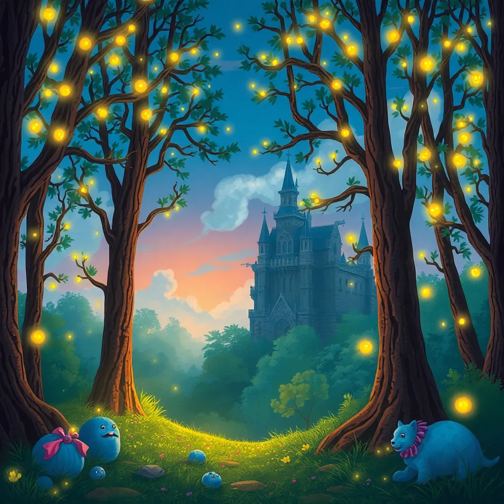 Create a whimsical illustration of a fantastical forest, featuring towering trees with glowing mushrooms, sparkling fireflies, and a full moon shining down. Incorporate intricate details and textures to bring this enchanting scene to life. Use a color palette of soft greens, blues, and yellows to evoke a sense of wonder.