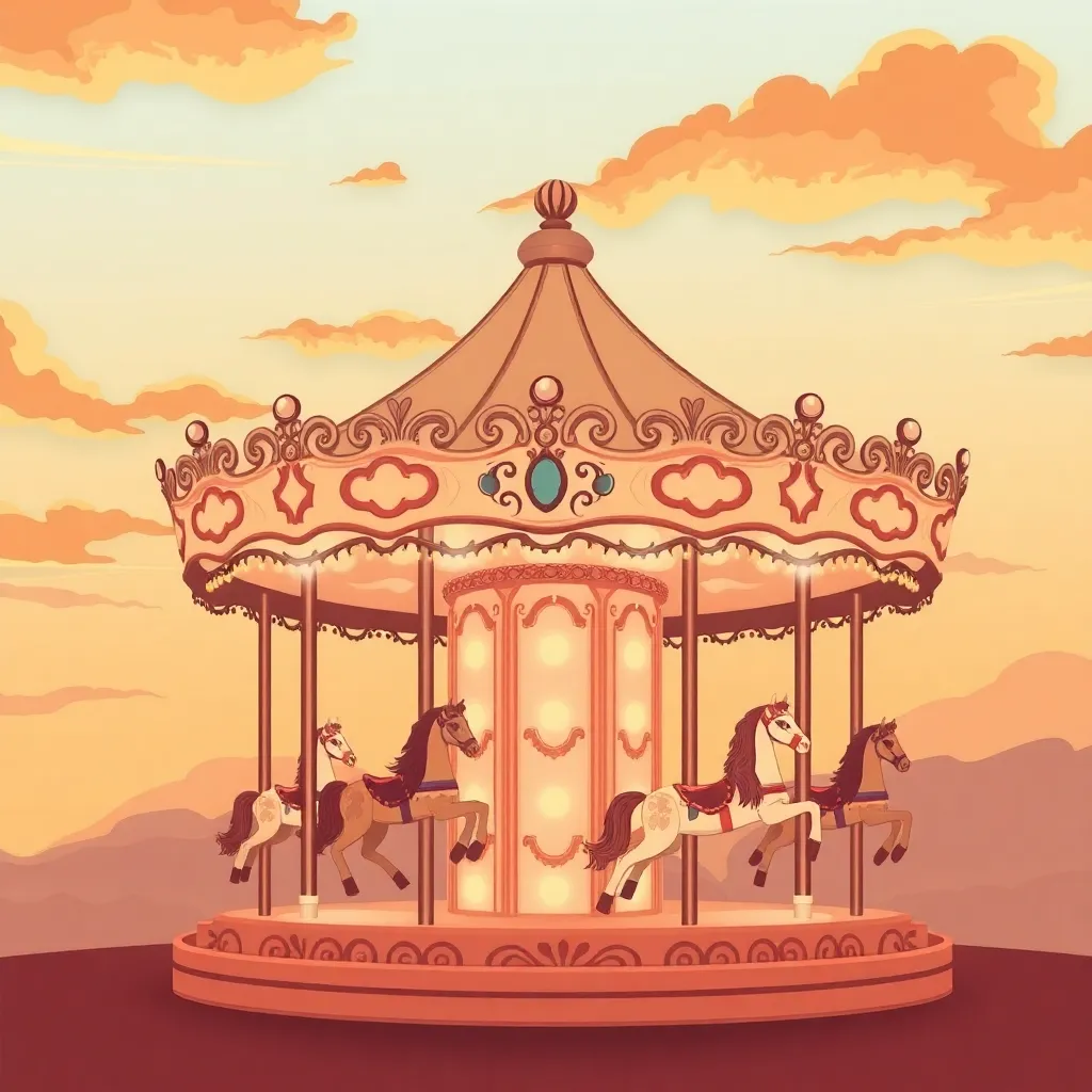 Create a whimsical illustration of a vintage-inspired carousel, set against a warm sunset backdrop with wispy clouds. Incorporate intricate details like wooden horses, a delicate canopy, and a hint of fairy lights. Style should be reminiscent of classic children's book illustrations, with bold lines and soft, dreamy colors.