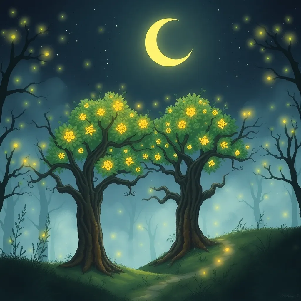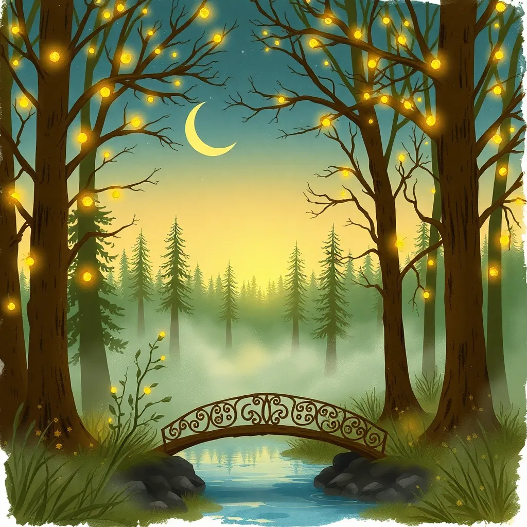 Create a whimsical illustration of a mystical forest at dawn. The trees should be adorned with glowing fireflies, and a subtle mist should be rising from the ground. Incorporate a small, intricate bridge in the foreground, and a crescent moon shining brightly in the sky. Use earthy tones and soft brushstrokes.