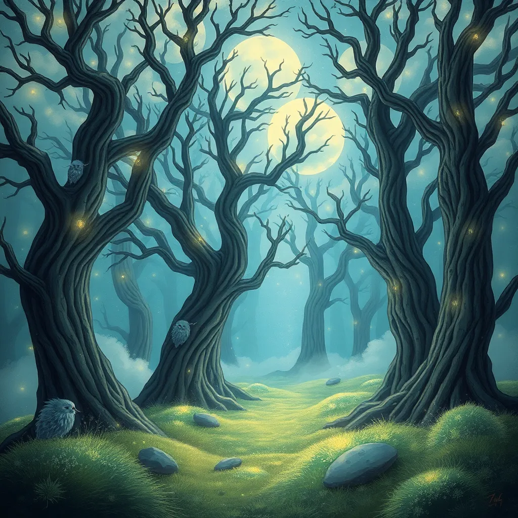 Create a whimsical illustration of a mystical forest, where ancient trees with glowing runes twist towards the sky, surrounded by a misty veil of iridescent clouds and a carpet of soft, luminescent moss. Incorporate subtle, shimmering highlights and soft, feathery textures to bring this enchanted scene to life.