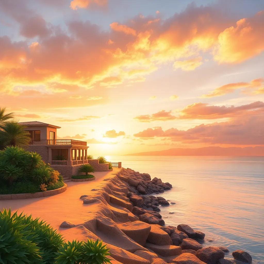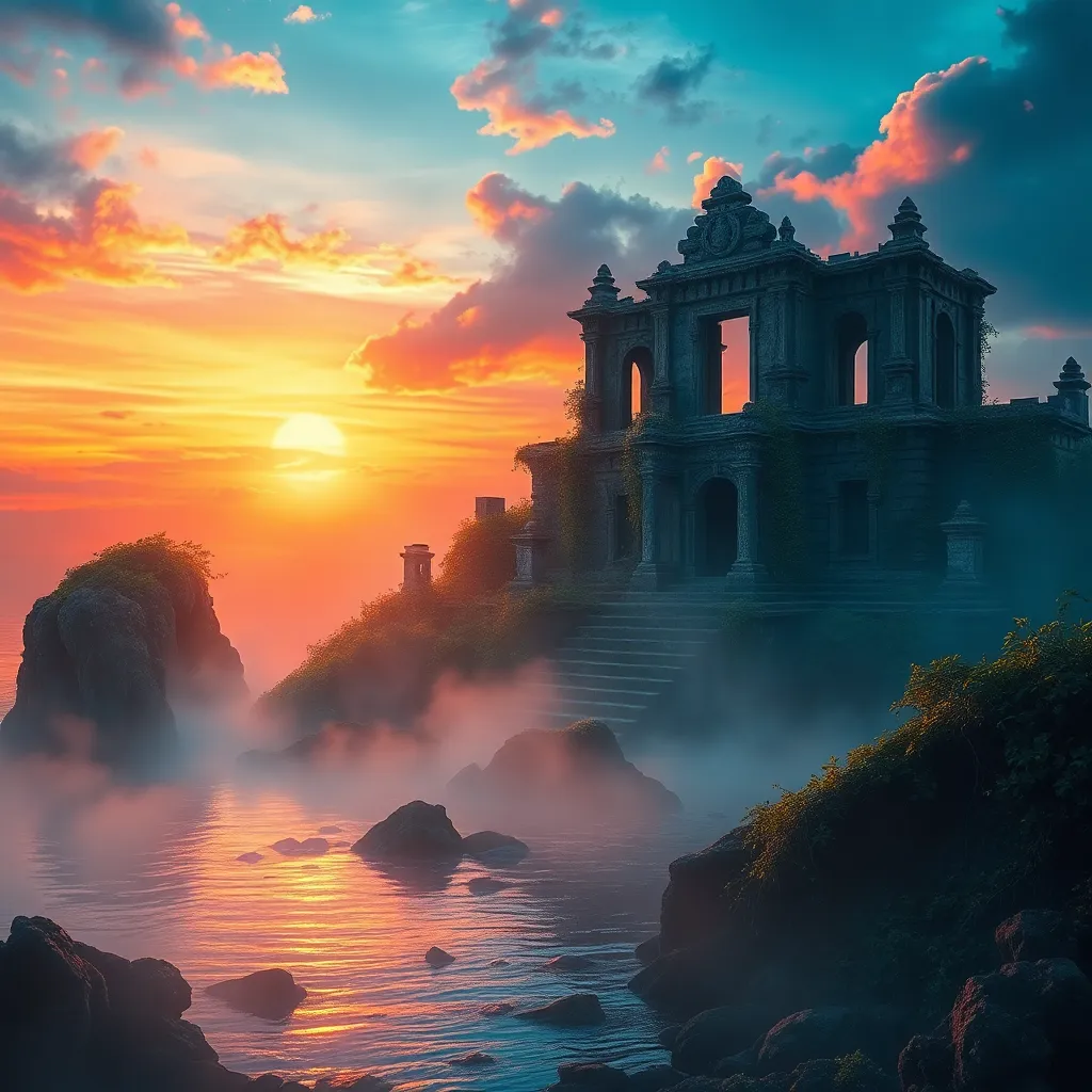Create a stunning sunset landscape on a mystical island, where ancient ruins are shrouded in mist and vines. Incorporate vibrant colors, warm lighting, and subtle texture to evoke a sense of mystery and wonder. Generate an AI image that transports the viewer to this enchanting and otherworldly setting.