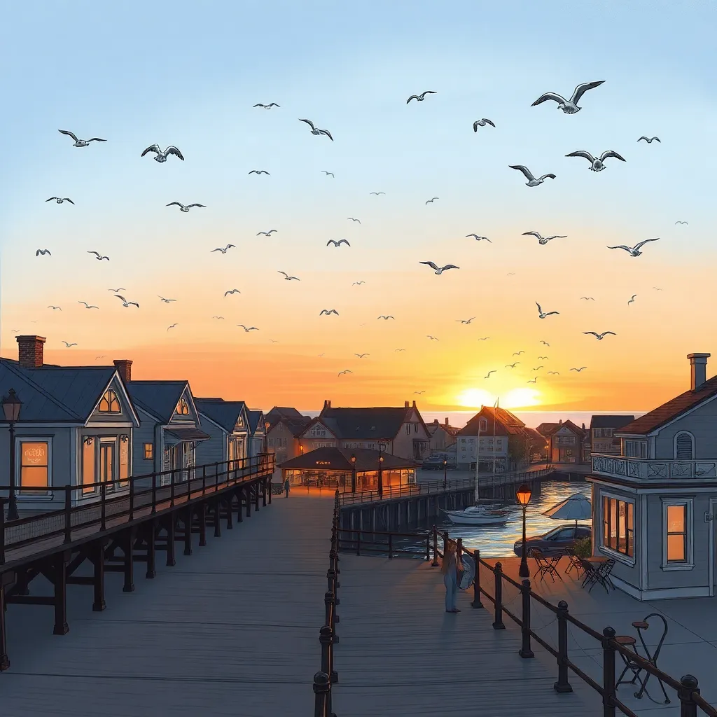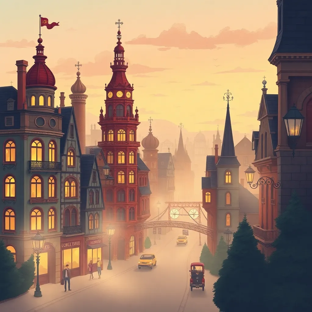 Create a whimsical illustration of a vintage-inspired cityscape at dusk. Incorporate intricate architecture, twinkling streetlights, and a hint of mist. The scene should evoke a sense of nostalgia and wonder. Use a mix of warm and cool colors to capture the magical atmosphere of this enchanting evening scene.