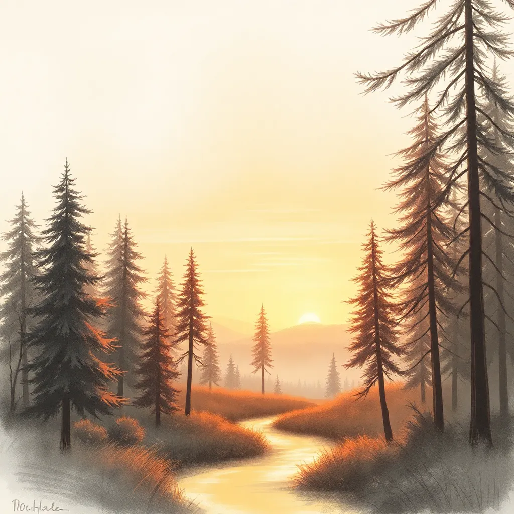 Create a stunning sketch of a serene forest landscape at sunset. Capture the warmth of the golden hour with soft, feathery trees and a misty atmosphere. Incorporate subtle, swirling patterns in the sky and a meandering stream that disappears into the distance. Soften the colors and blend the edges for a dreamy effect.