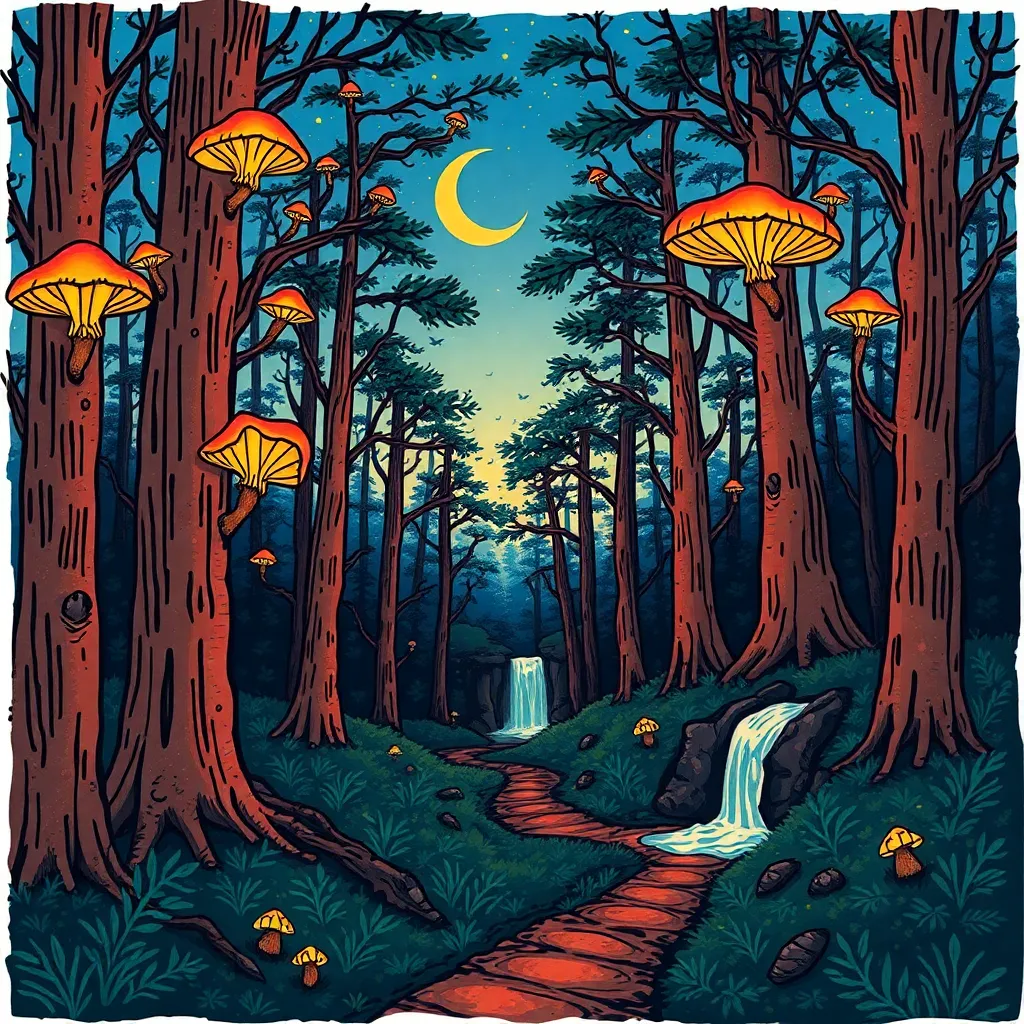 Create a whimsical, hand-drawn illustration of a mystical forest at dusk. Incorporate towering trees with glowing mushrooms, a crescent moon shining through the canopy, and a winding path leading to a shimmering waterfall. Use a mix of bold lines, soft textures, and vibrant colors to bring this enchanted scene to life.