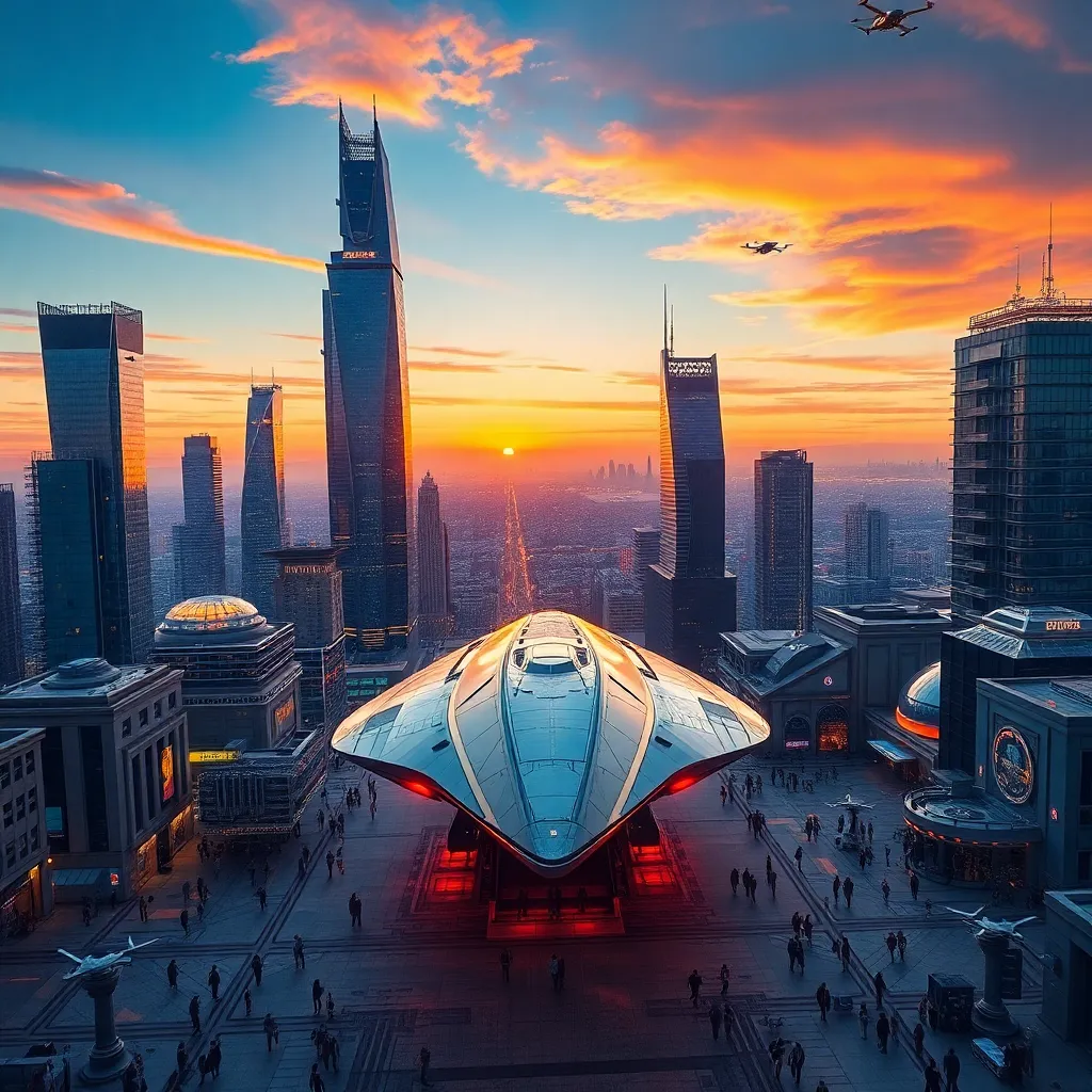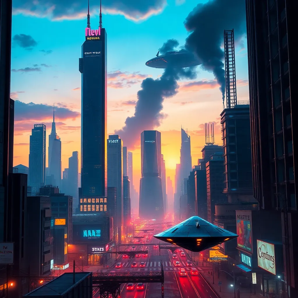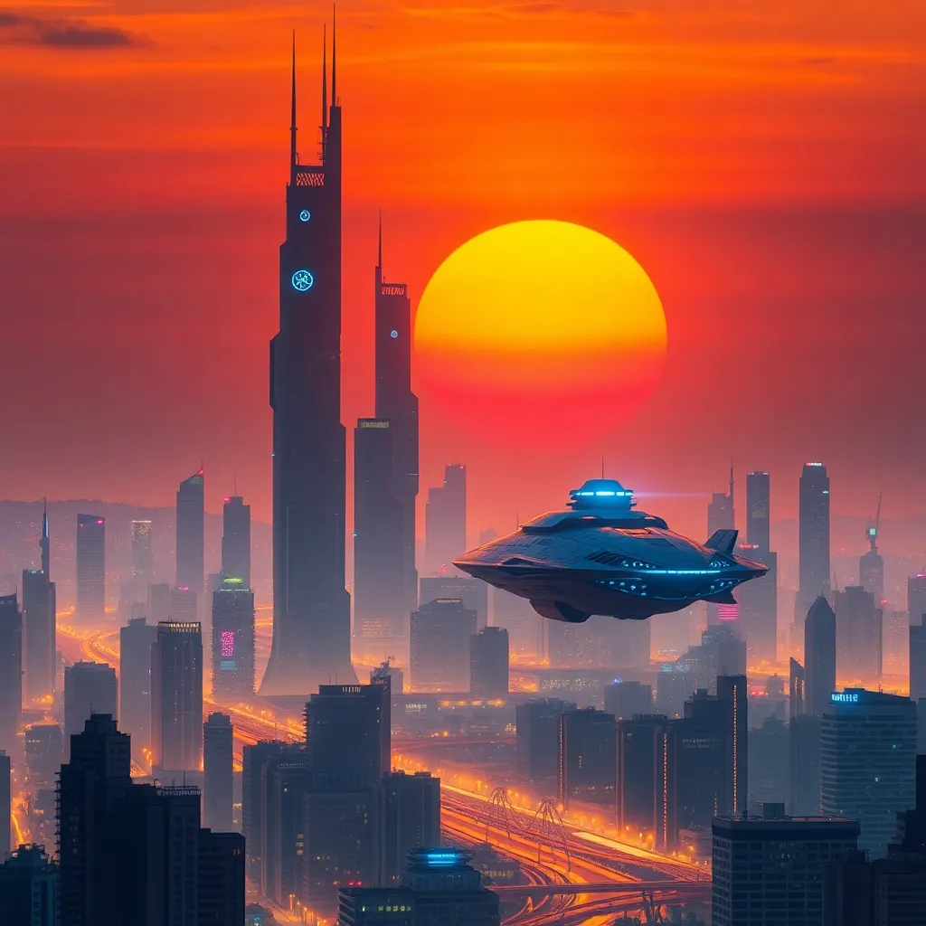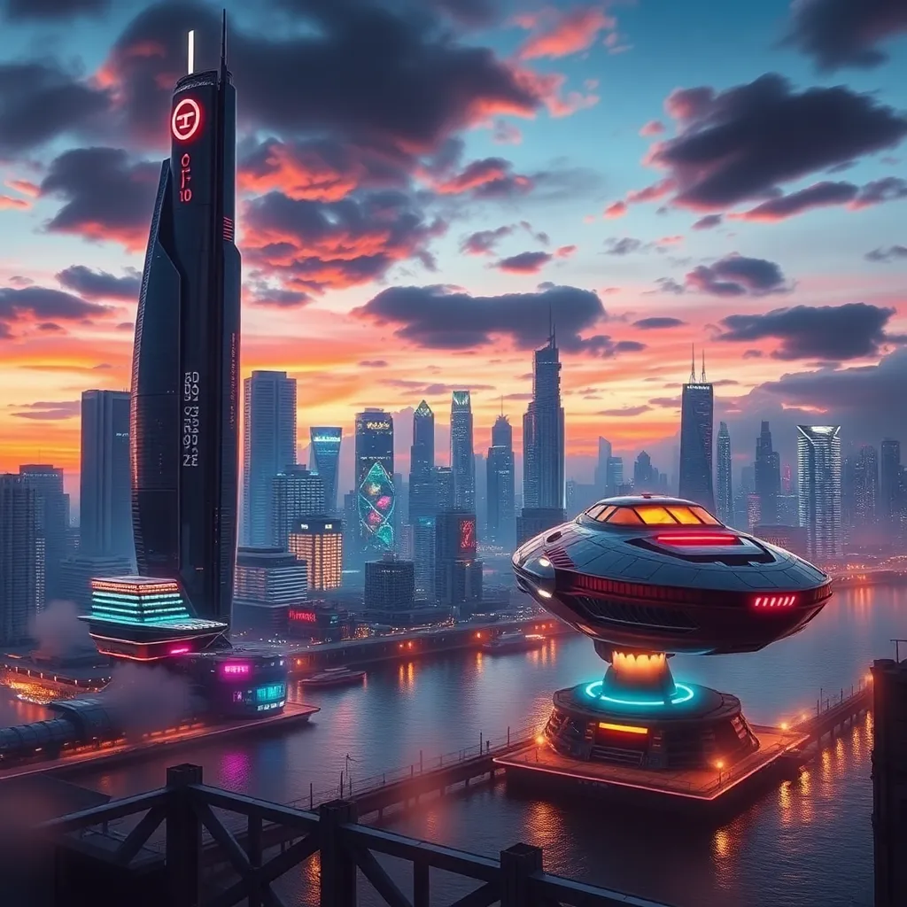 Create a stunning futuristic cityscape at sunset. Imagine a sprawling metropolis with sleek skyscrapers, neon lights, and a vibrant atmosphere. Incorporate a majestic spaceship docked in the distance, with a subtle glow emanating from its hull. Use a bold color palette with warm oranges, blues, and purples.
