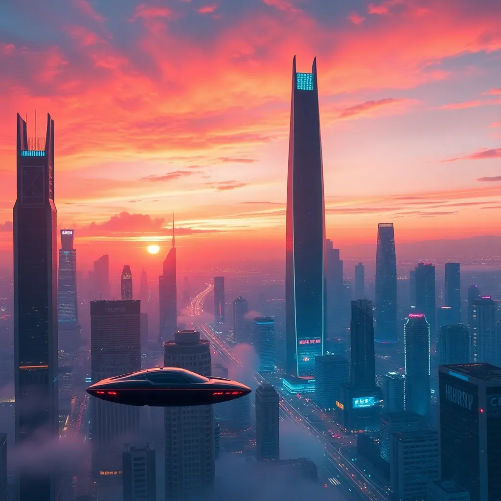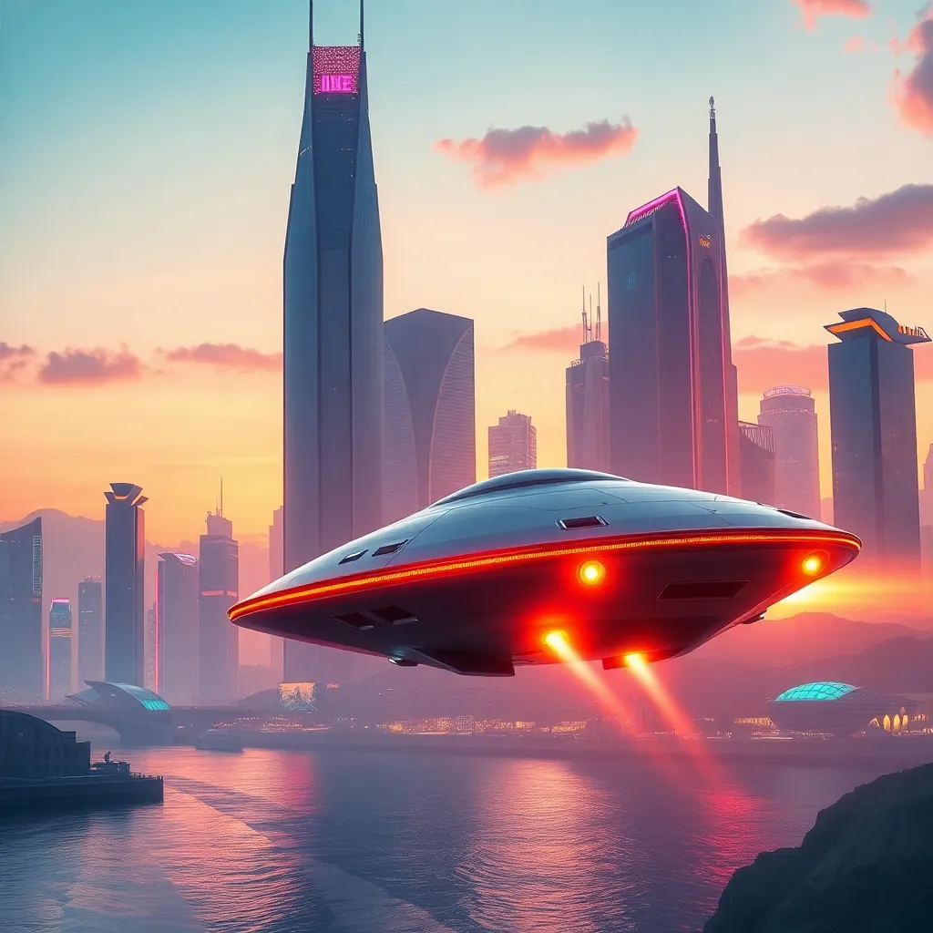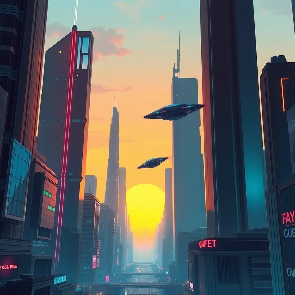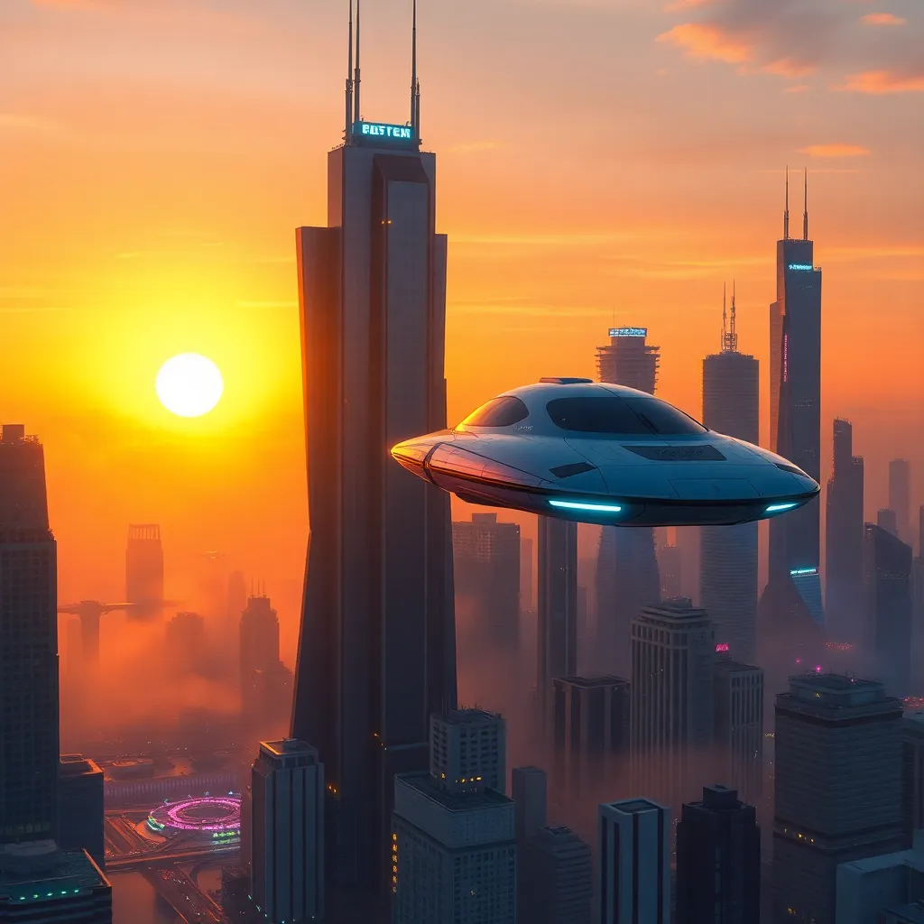 Create a stunning futuristic cityscape at sunset. Imagine a sprawling metropolis with sleek skyscrapers, neon lights, and a vibrant atmosphere. Incorporate a majestic spaceship docked in the distance, with a subtle glow emanating from its hull. Use a bold color palette with warm oranges, blues, and purples.