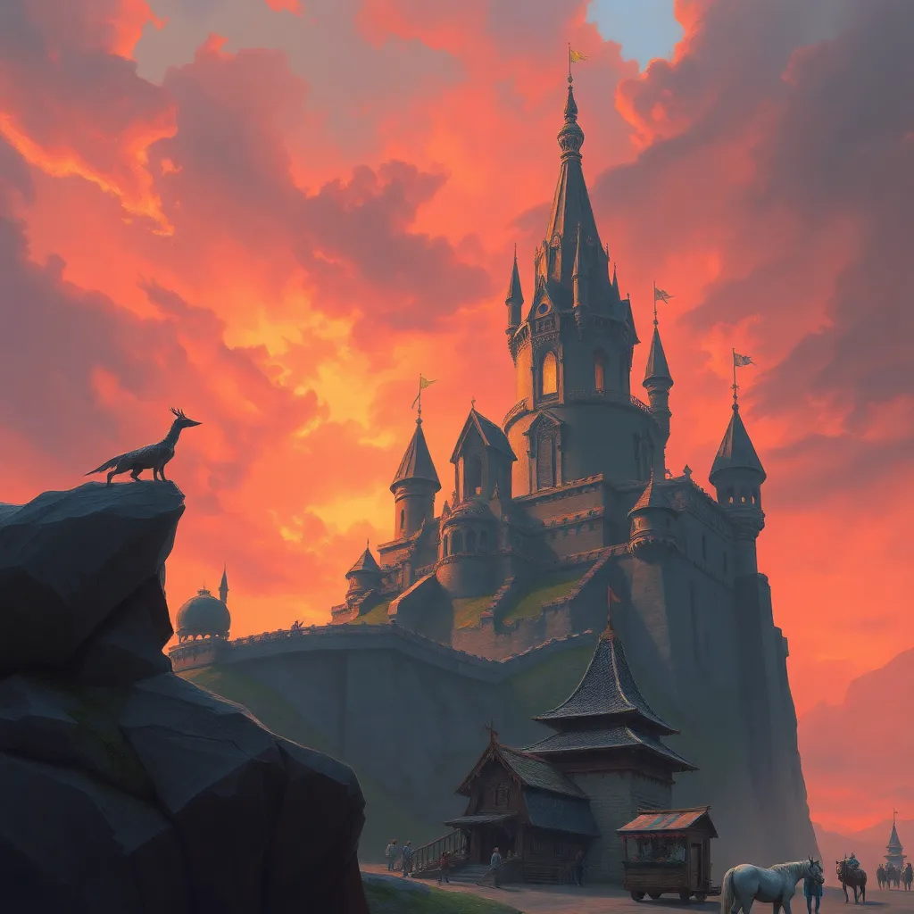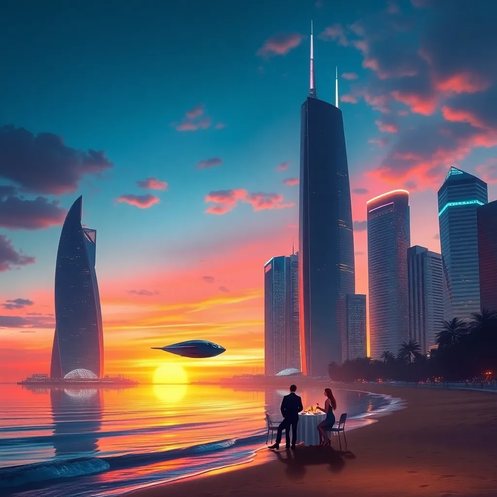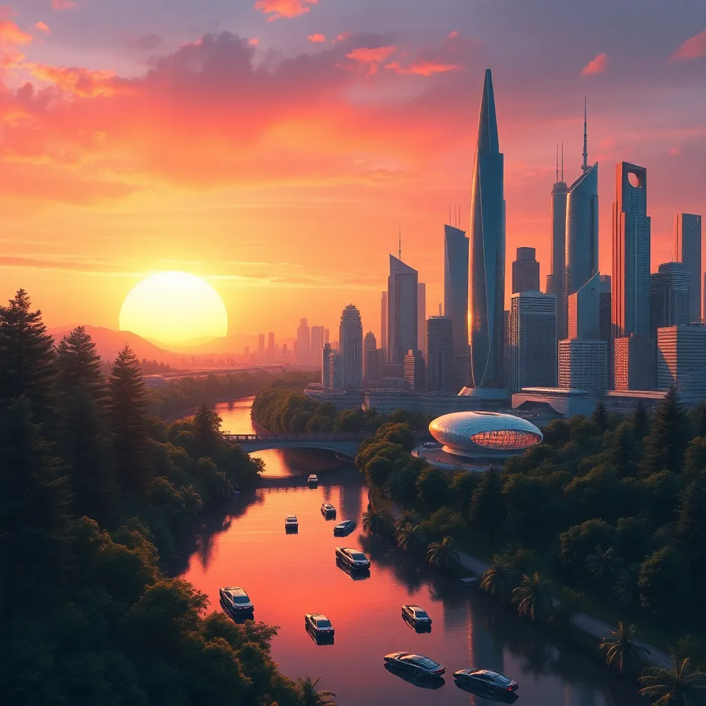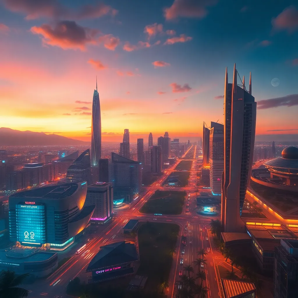 Create a stunning futuristic cityscape at sunset. Imagine a sprawling metropolis with sleek skyscrapers, neon lights, and a vibrant atmosphere. Incorporate a majestic spaceship docked in the distance, with a subtle glow emanating from its hull. Use a bold color palette with warm oranges, blues, and purples.