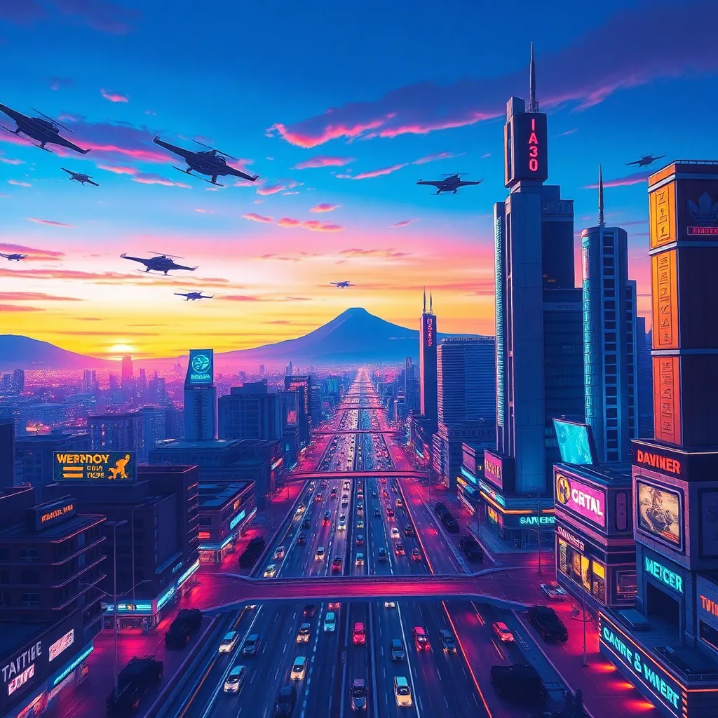 Create a vibrant, futuristic cityscape at sunset. Imagine a bustling metropolis with sleek skyscrapers, neon-lit streets, and a distant mountain range. Incorporate a sense of movement and energy, with flying cars and hoverbikes zipping through the air. Use a palette of blues, oranges, and purples to capture the atmosphere.