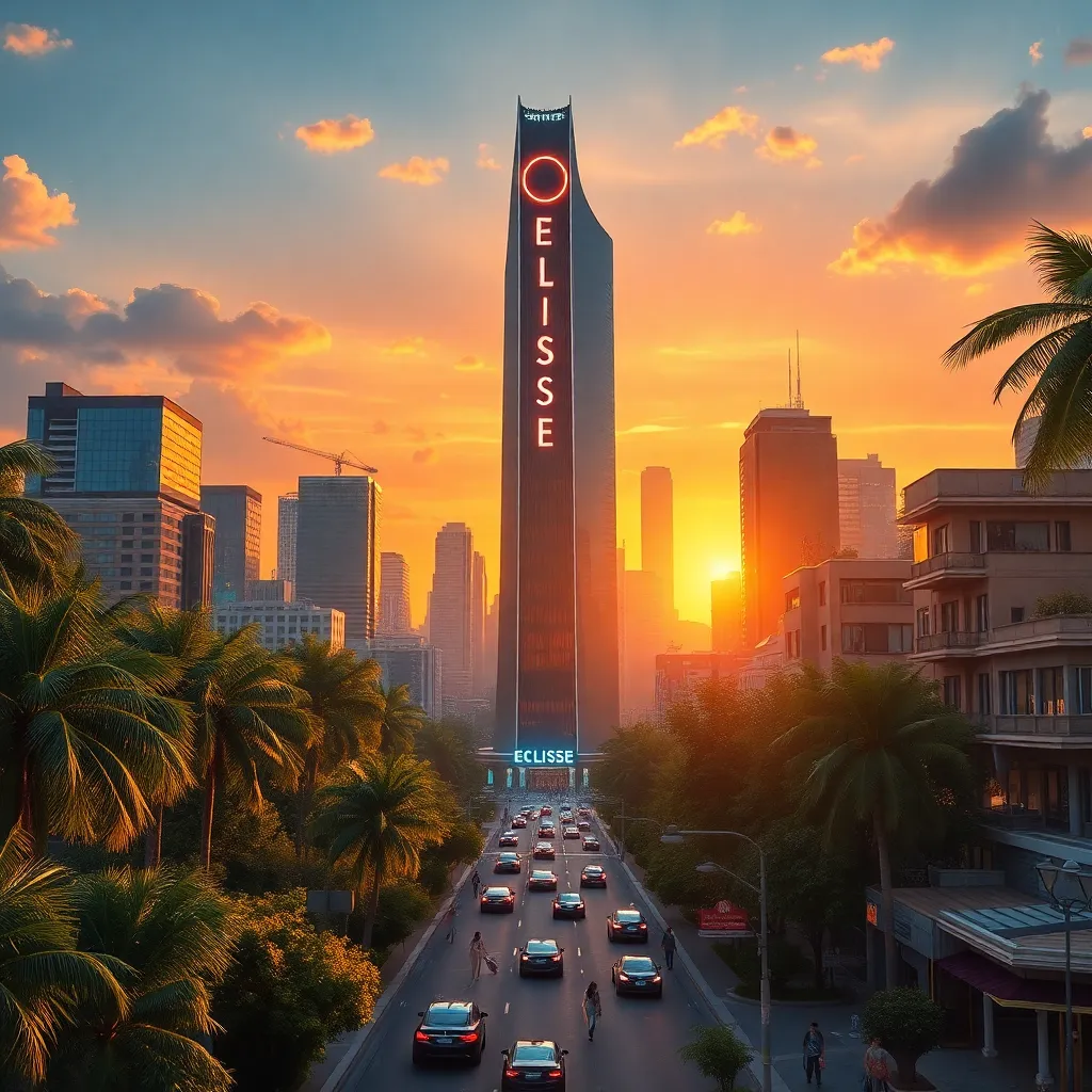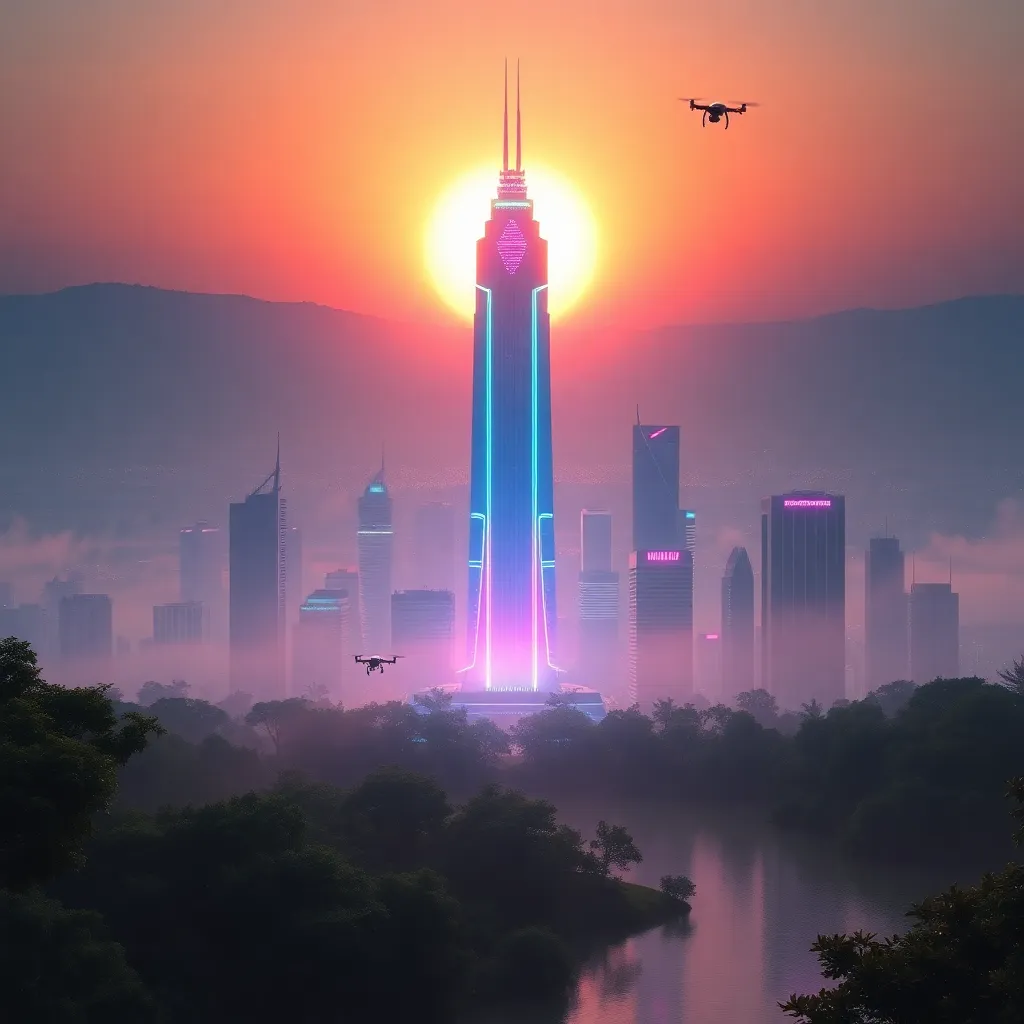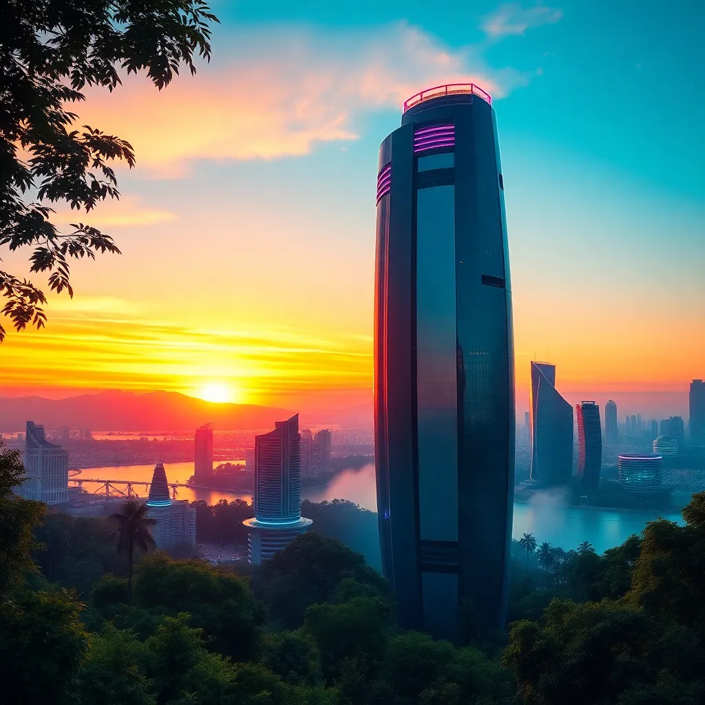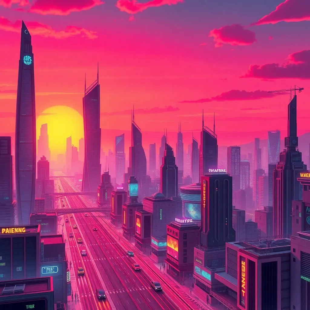 Create a stunning futuristic cityscape at sunset. Imagine a sprawling metropolis with sleek skyscrapers, neon-lit streets, and a vibrant atmosphere. Incorporate a subtle haze and warm colors to capture the essence of a tropical paradise. Use a mix of bold lines and soft textures to bring the scene to life.