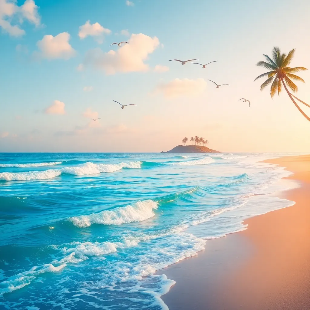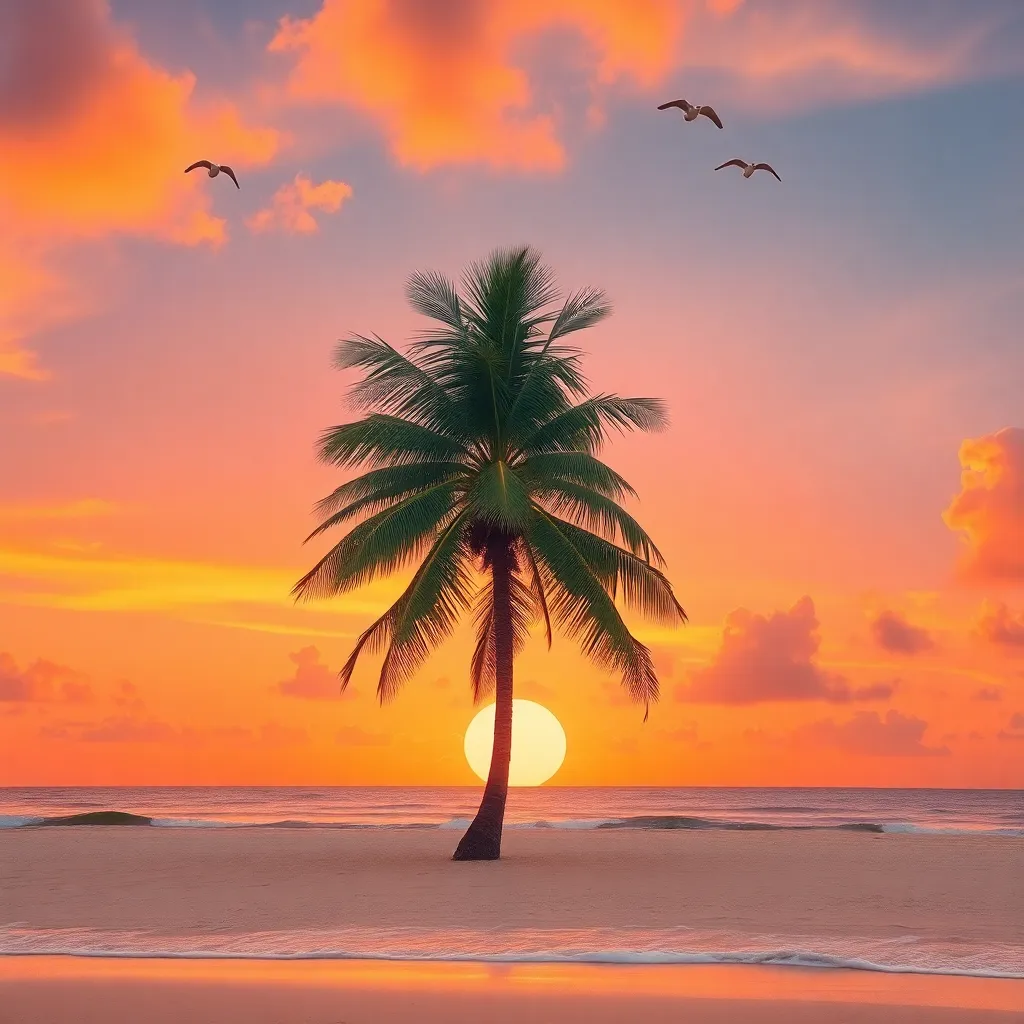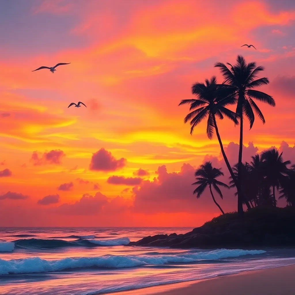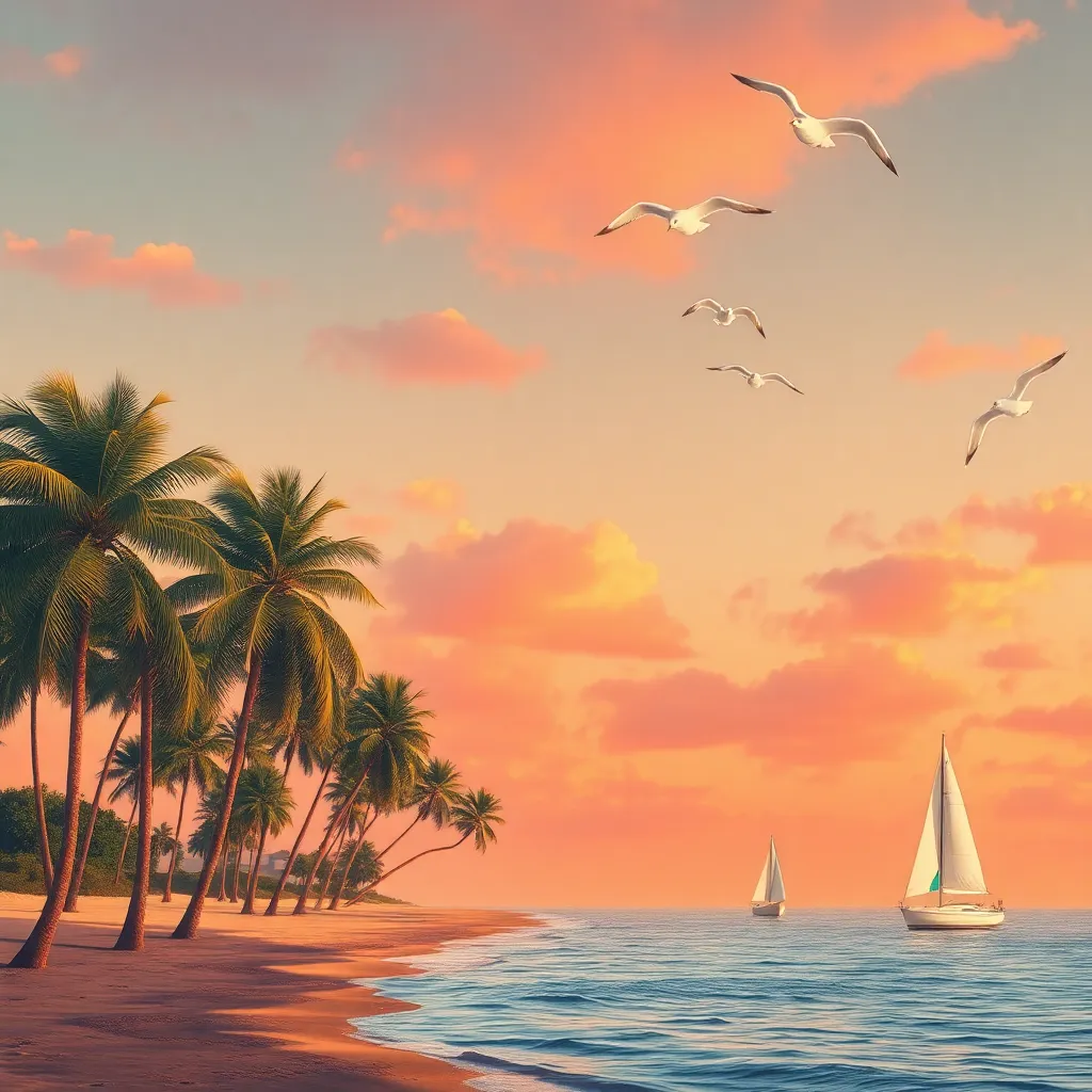 Create a stunning futuristic cityscape at sunset. Imagine a sprawling metropolis with sleek skyscrapers, neon-lit streets, and a vibrant atmosphere. Incorporate a subtle haze and warm colors to capture the essence of a tropical paradise. Use a mix of bold lines and soft textures to bring the scene to life.