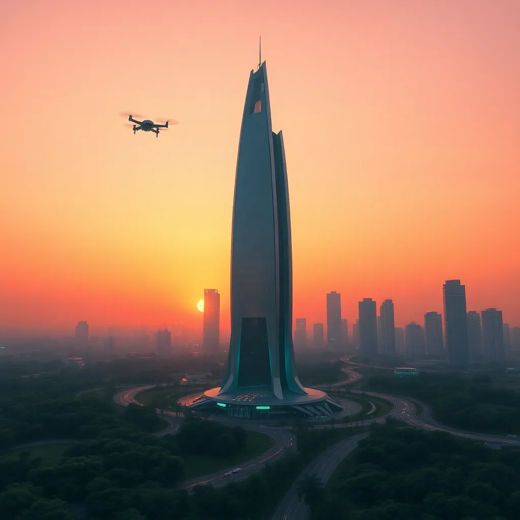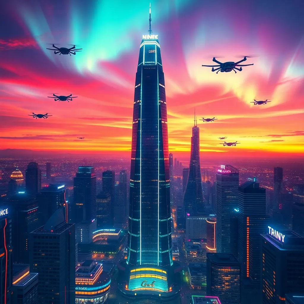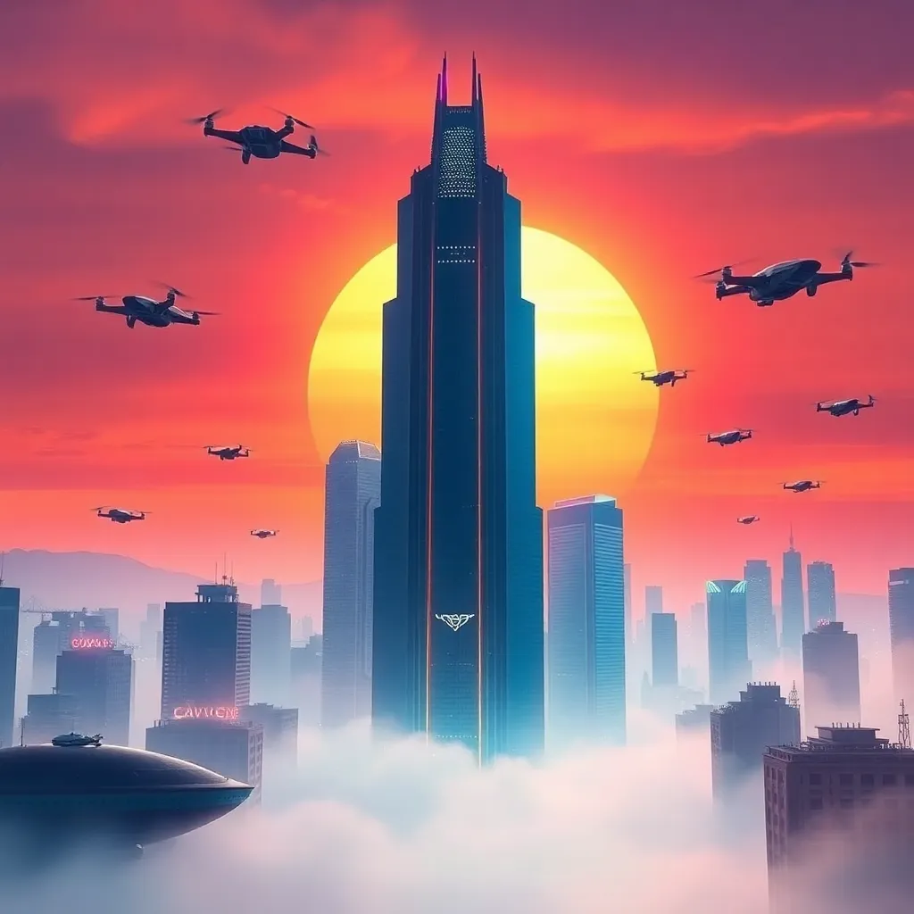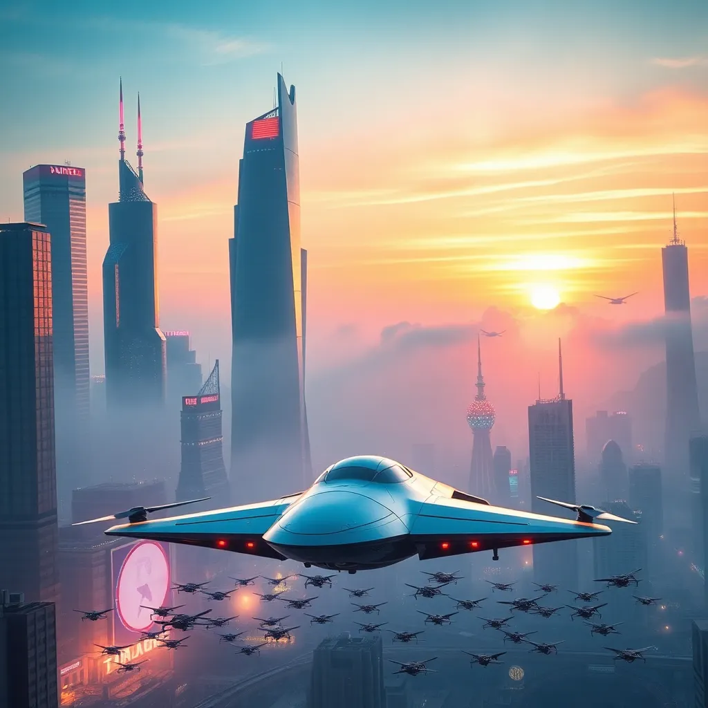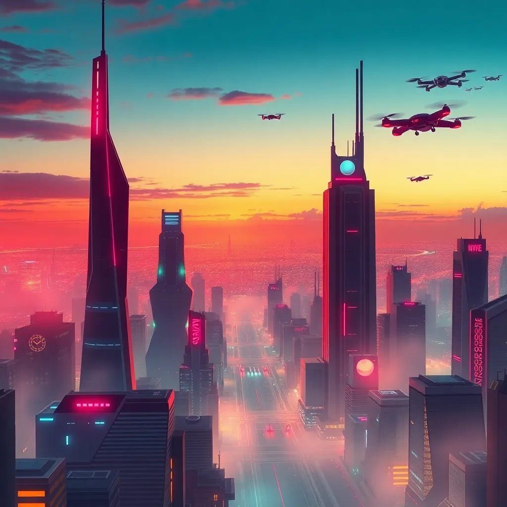 Create a futuristic cityscape at sunset with towering skyscrapers, neon lights, and a hint of misty fog. Incorporate a sleek, silver spaceship landing in the foreground, surrounded by a swarm of tiny drones. Use a vibrant color palette with shades of blue, orange, and purple to capture the city's energy.