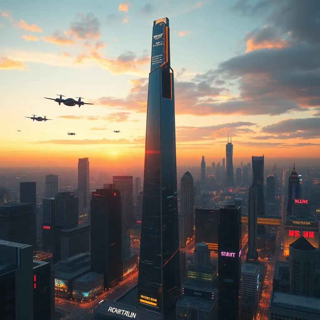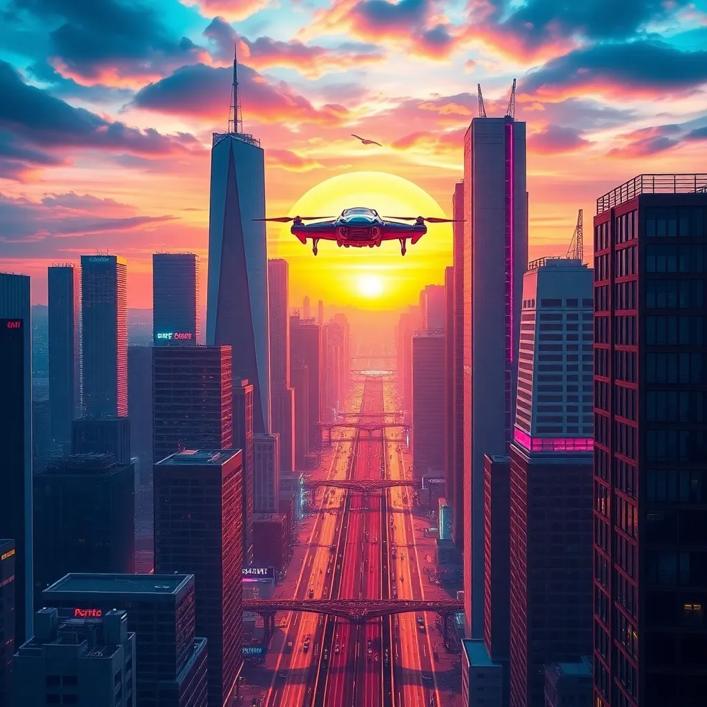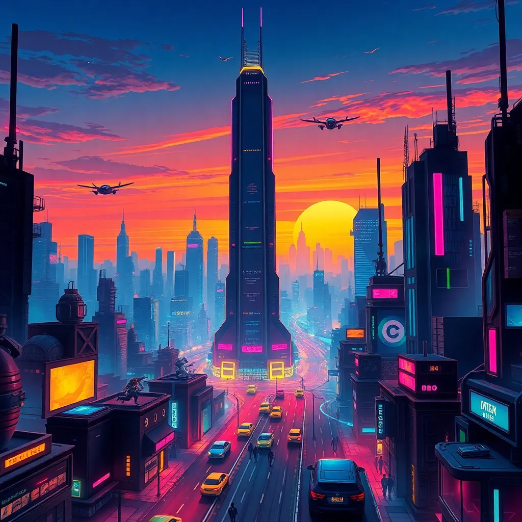 Create a futuristic cityscape at sunset with a towering skyscraper in the center, surrounded by a maze of neon-lit streets and towering buildings. Incorporate a sense of movement and energy with flying cars, robots, and people in motion. Use vibrant colors and abstract shapes to add depth and texture.