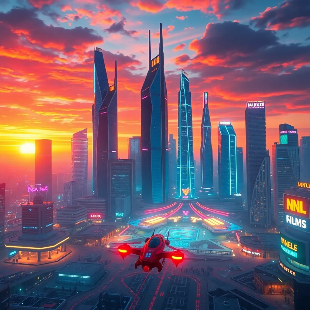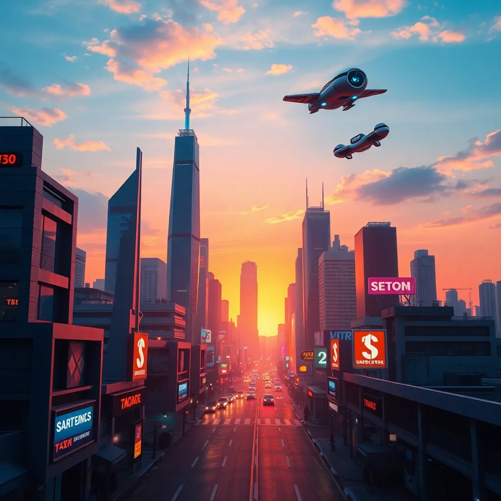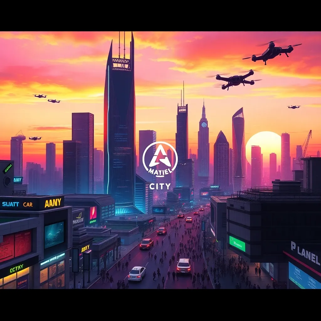 Create a futuristic cityscape at sunset, with sleek skyscrapers, neon-lit streets, and a vibrant orange-purple sky. Incorporate flying cars and hovering drones, with a prominent city logo and a bustling crowd of humans and robots. Use bold colors and high-tech textures to bring this futuristic world to life.