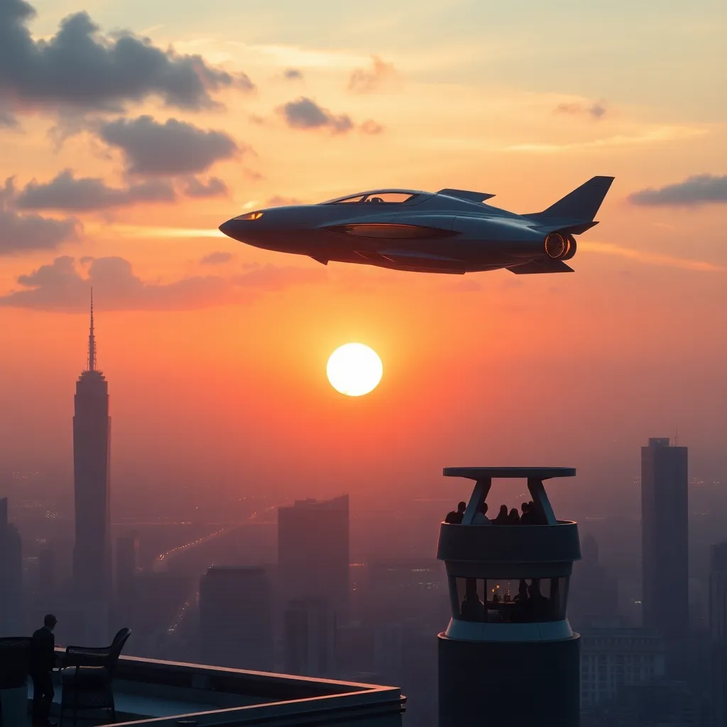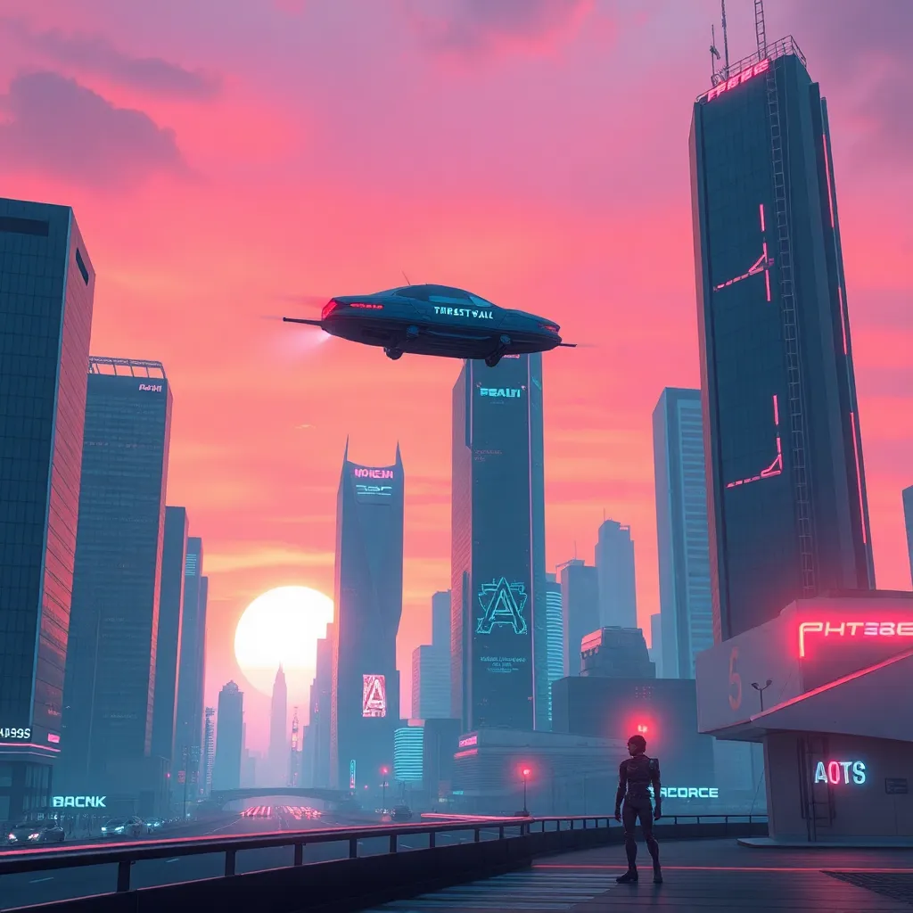 Create a futuristic cityscape at sunset with sleek skyscrapers, neon lights, and a vibrant orange-pink sky. Incorporate a flying taxi hovering above the city, a robotic pedestrian walking on the sidewalk, and a subtle haze of pollution in the air. Blend realistic textures with stylized, neon-lit accents.