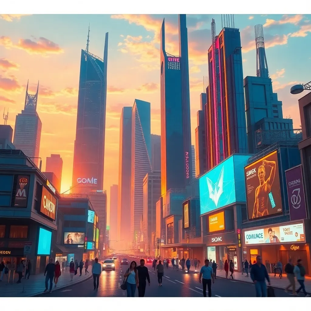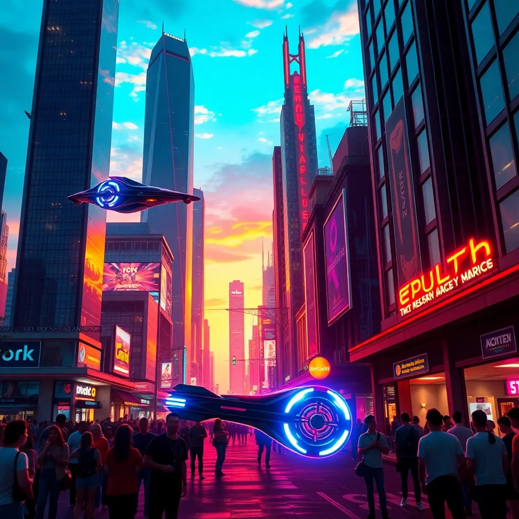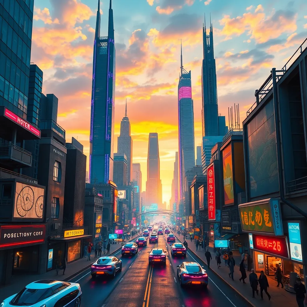 Create a futuristic cityscape at sunset, with towering skyscrapers, neon lights, and a bustling street filled with hovercars and pedestrians. Incorporate a sense of movement and energy, with vibrant colors and dynamic lighting. Blend realistic and stylized elements to create a unique and captivating image.