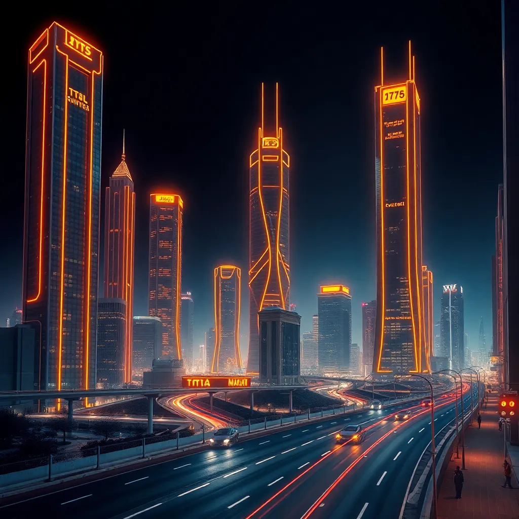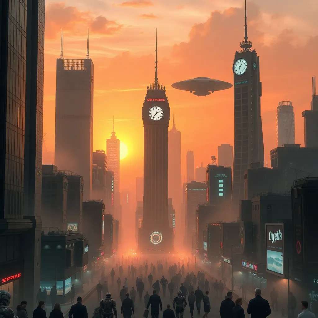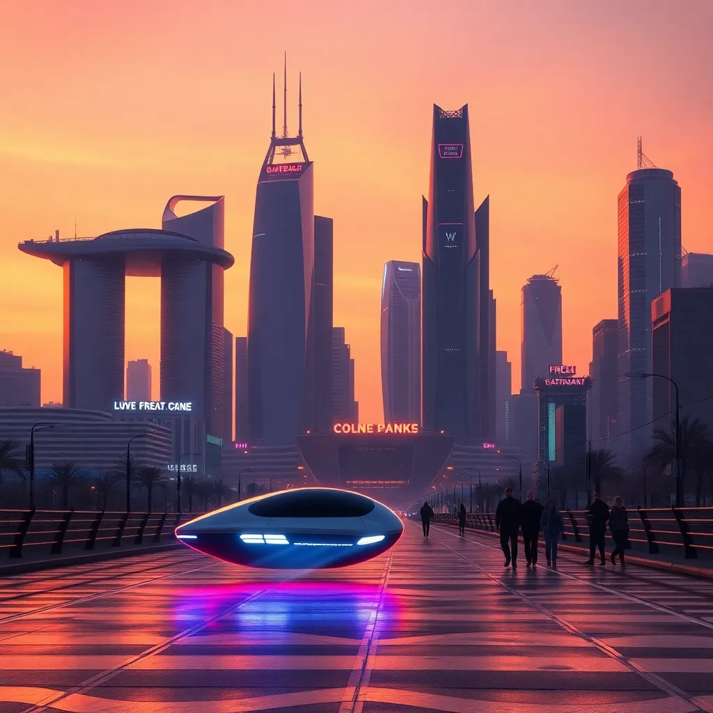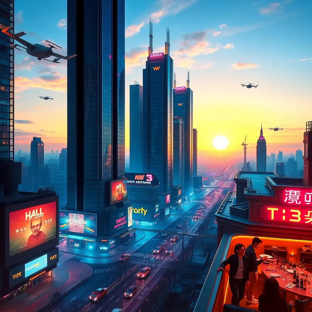 Create a futuristic cityscape at sunset, with towering skyscrapers, neon lights, and a bustling street filled with hovercars and pedestrians. Incorporate a sense of movement and energy, with vibrant colors and dynamic lighting. Blend realistic and stylized elements to create a unique and captivating image.