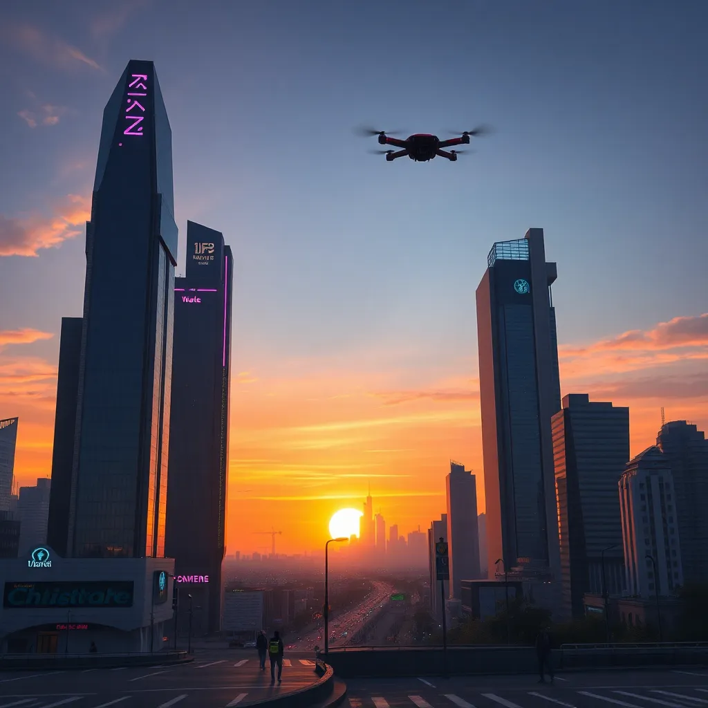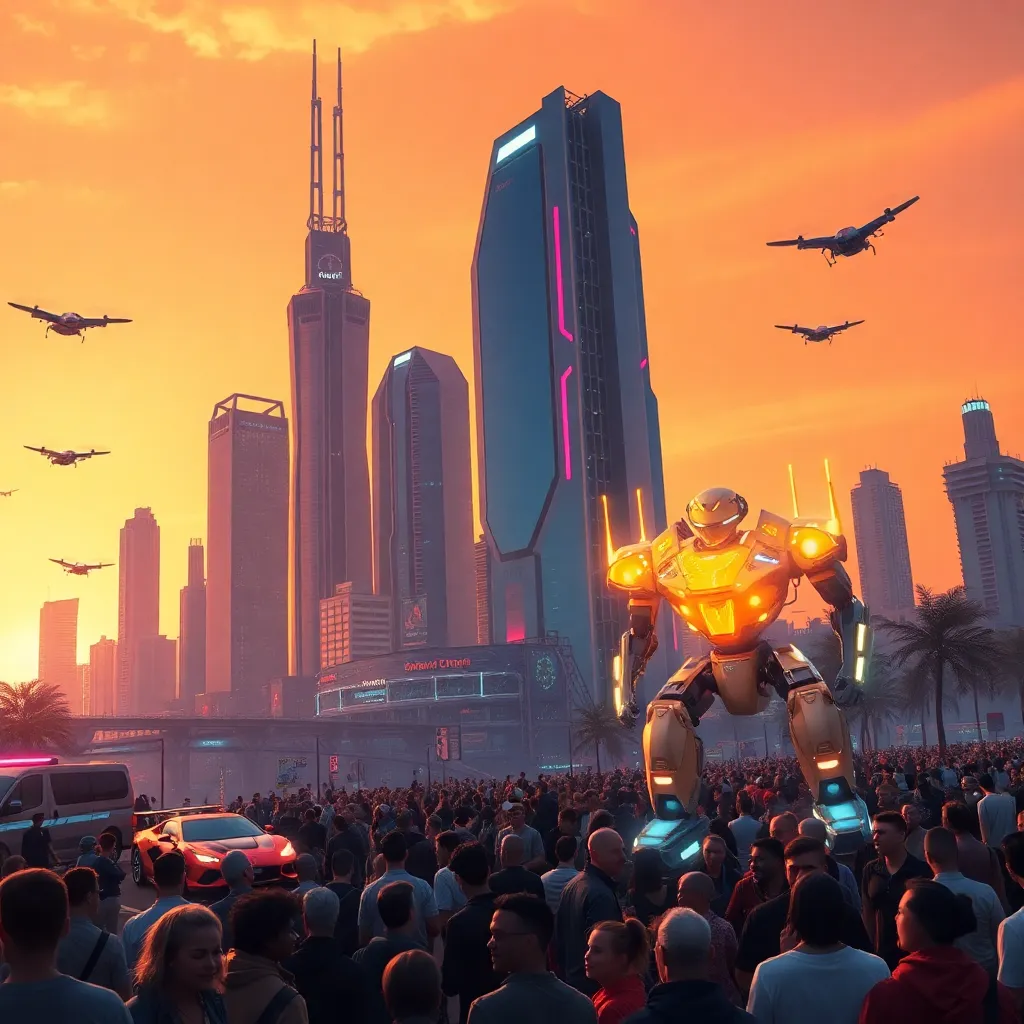 Create a futuristic cityscape at sunset with towering skyscrapers, glowing neon lights, and a vibrant orange sky. Incorporate sleek, high-tech cars and hoverboards zipping by. Add a few flying drones and a giant, glowing robot in the foreground, surrounded by a bustling crowd of people from diverse backgrounds.