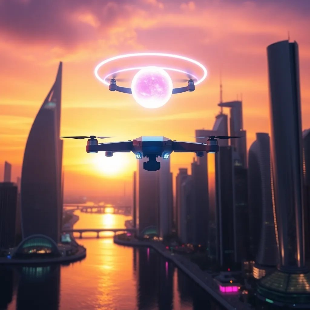 Create a futuristic cityscape at sunset, with sleek skyscrapers and neon lights reflecting off the water. Incorporate a hovering drone with a glowing orb, surrounded by a halo of light. The sky should be a warm orange-yellow with purple hues. The image should have a sense of depth and dimensionality.