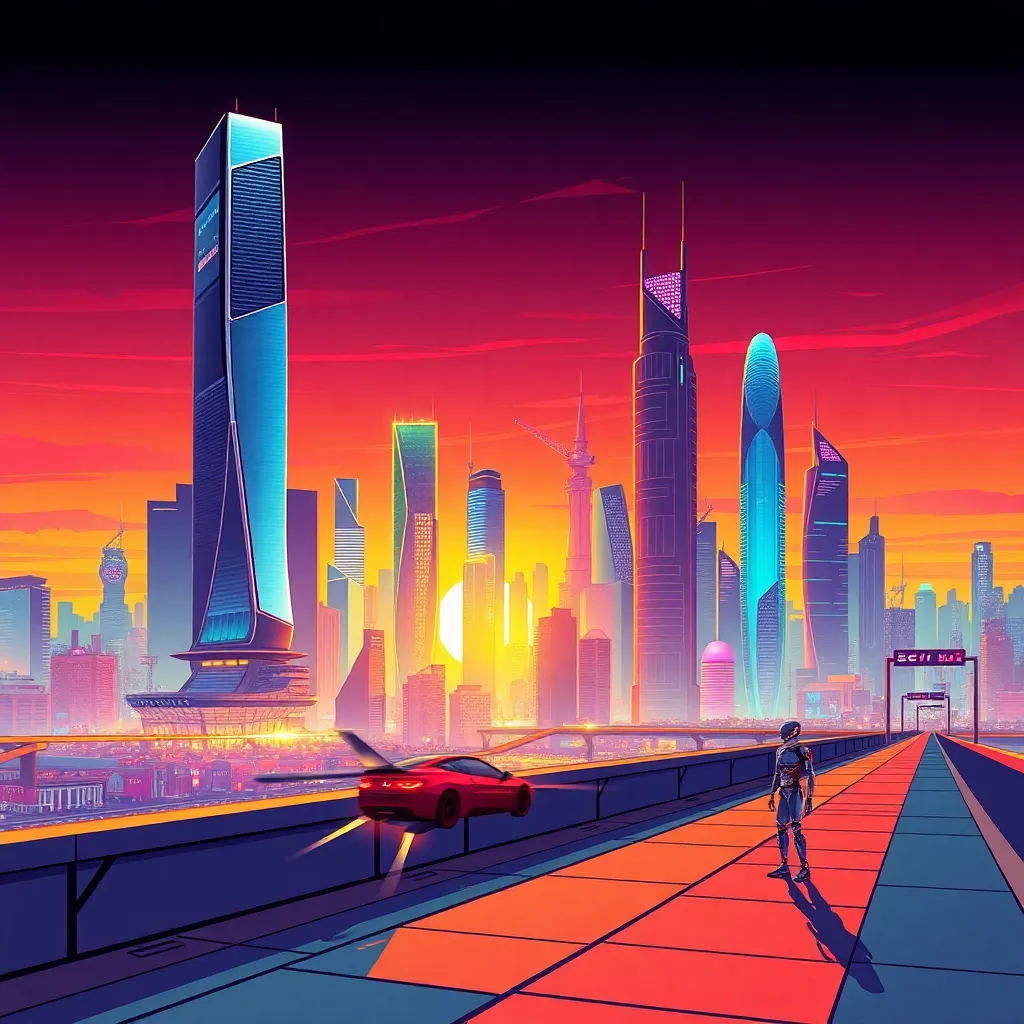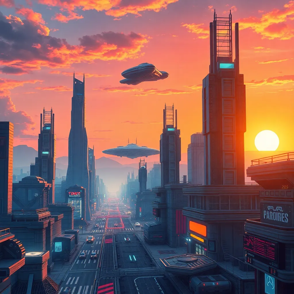 Create a futuristic cityscape at sunset, with sleek skyscrapers, neon-lit streets, and a distant spaceship docked in the sky. Incorporate a few flying cars and robots moving about, with a warm orange glow emanating from the setting sun. Use vibrant colors and detailed textures to bring the scene to life.
