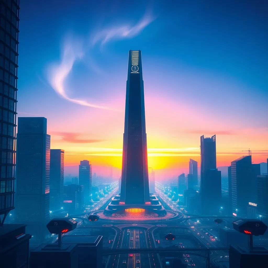 Create a futuristic cityscape at sunset with a sleek skyscraper in the center, surrounded by neon-lit streets and hovering cars. Incorporate a subtle aurora borealis effect in the sky. The dominant colors should be blues and purples, with accents of warm orange and yellow. Make it a breathtakingly beautiful scene.