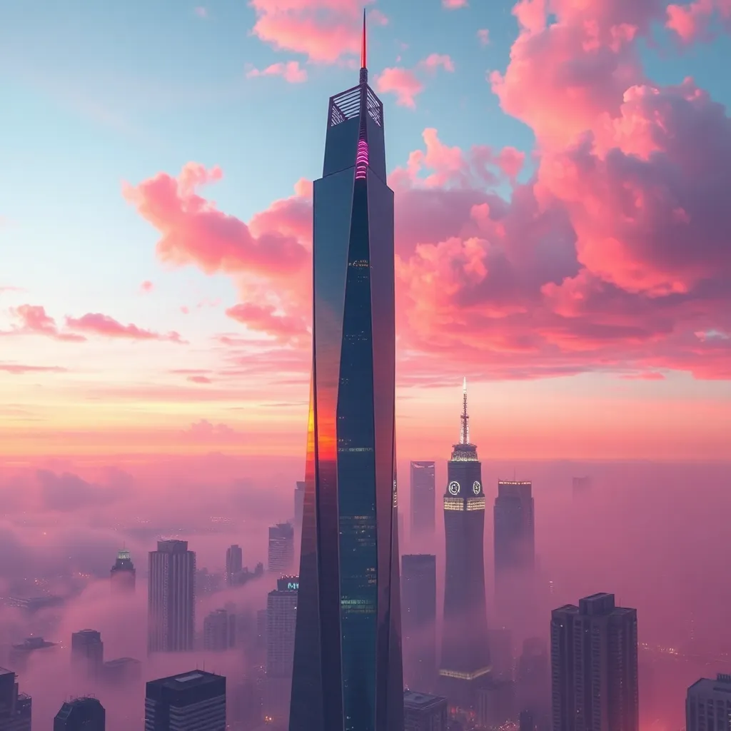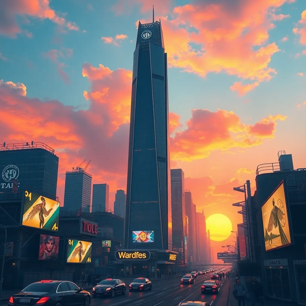 Create a futuristic cityscape at sunset with a sleek, silver skyscraper in the foreground, surrounded by a haze of orange and pink clouds. Incorporate neon-lit billboards and a busy street with hovercars and pedestrians. The atmosphere should be vibrant and energetic, with a sense of technology and innovation.