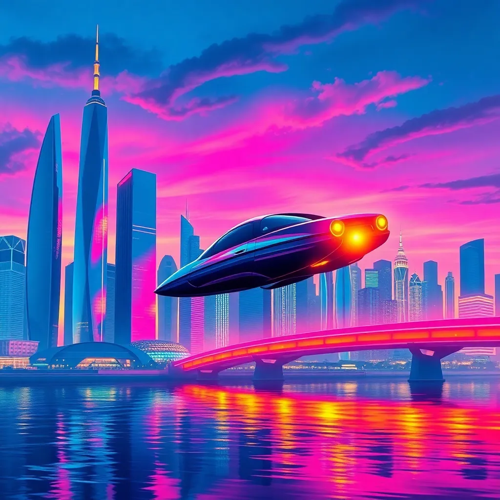 Create a futuristic cityscape at sunset with towering skyscrapers, glowing neon lights, and a misty atmosphere. Incorporate a sleek, silver hovercraft hovering above the city, with a blurred background of a vast, open ocean. Use vibrant colors and bold lines to capture the dynamic energy of the scene.