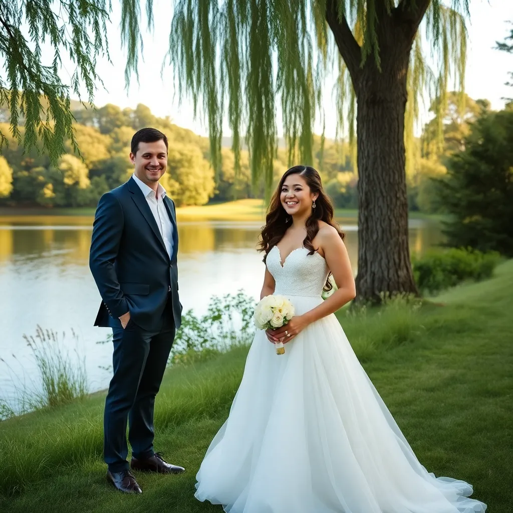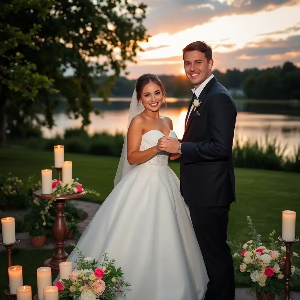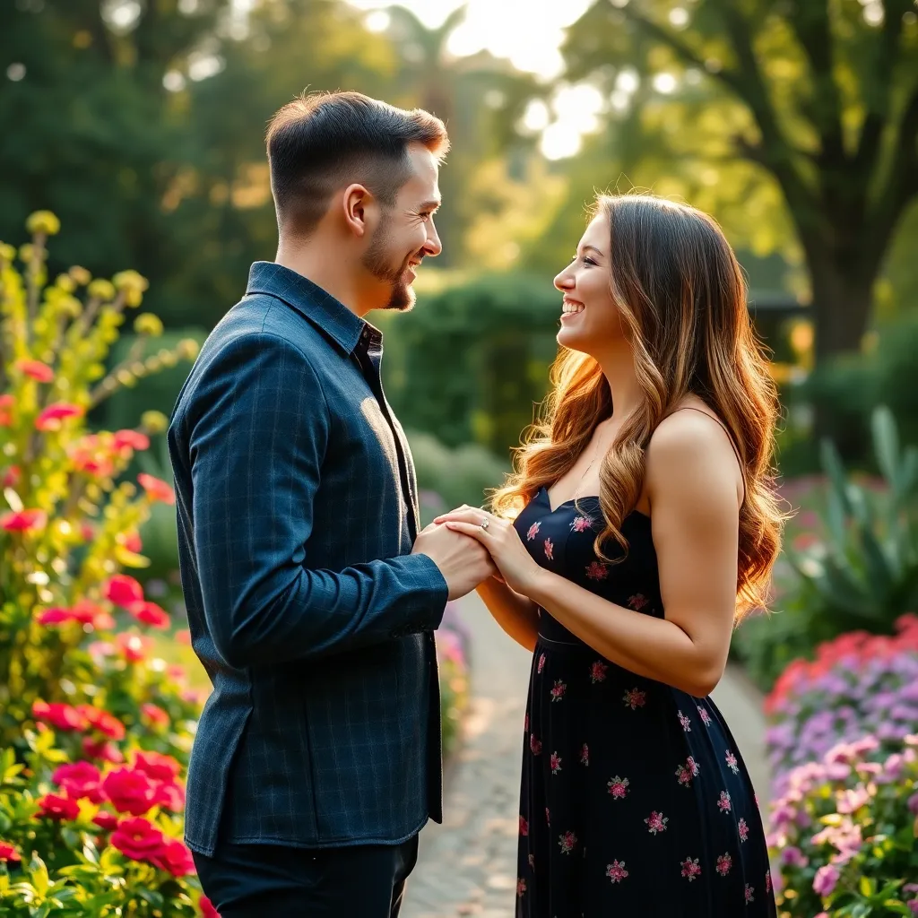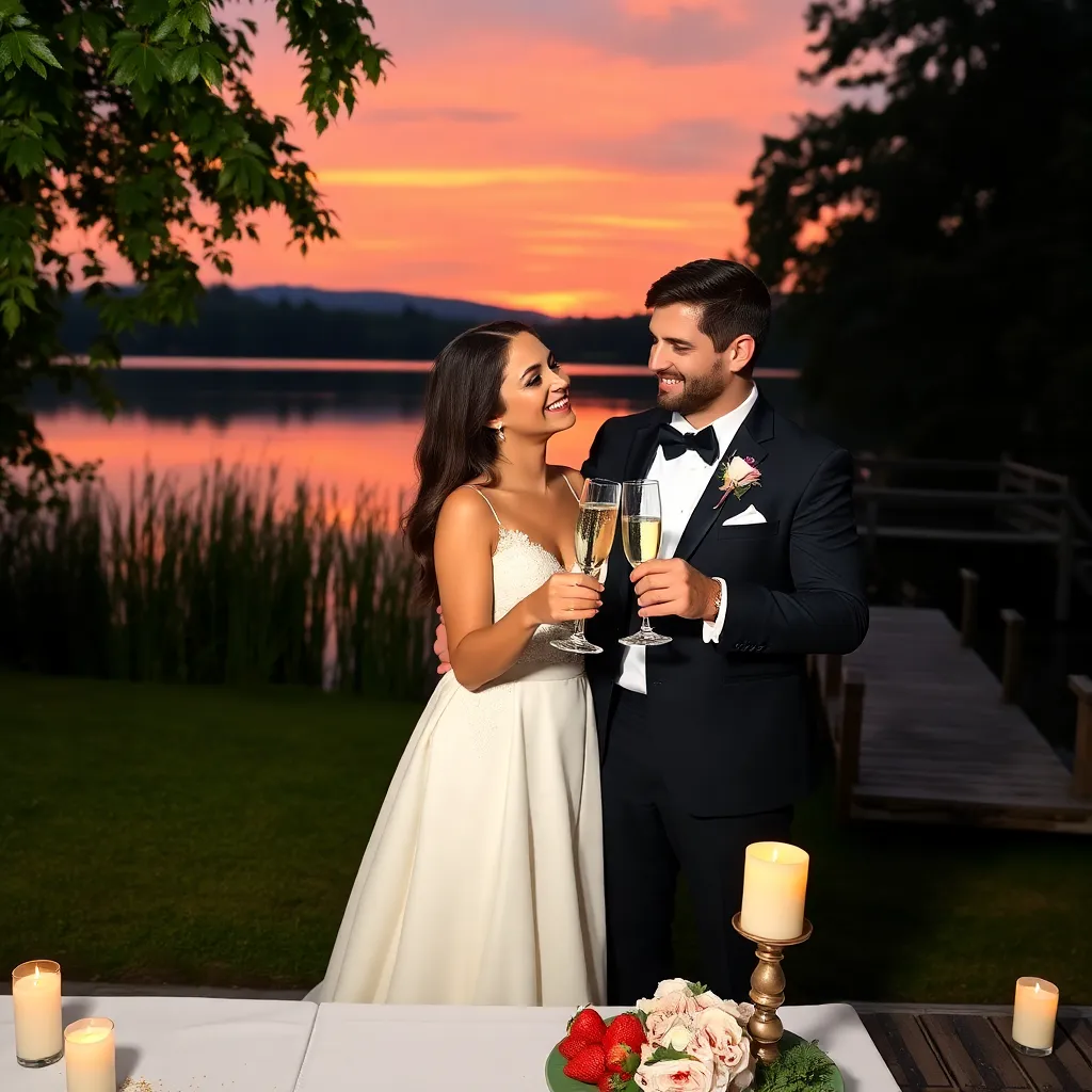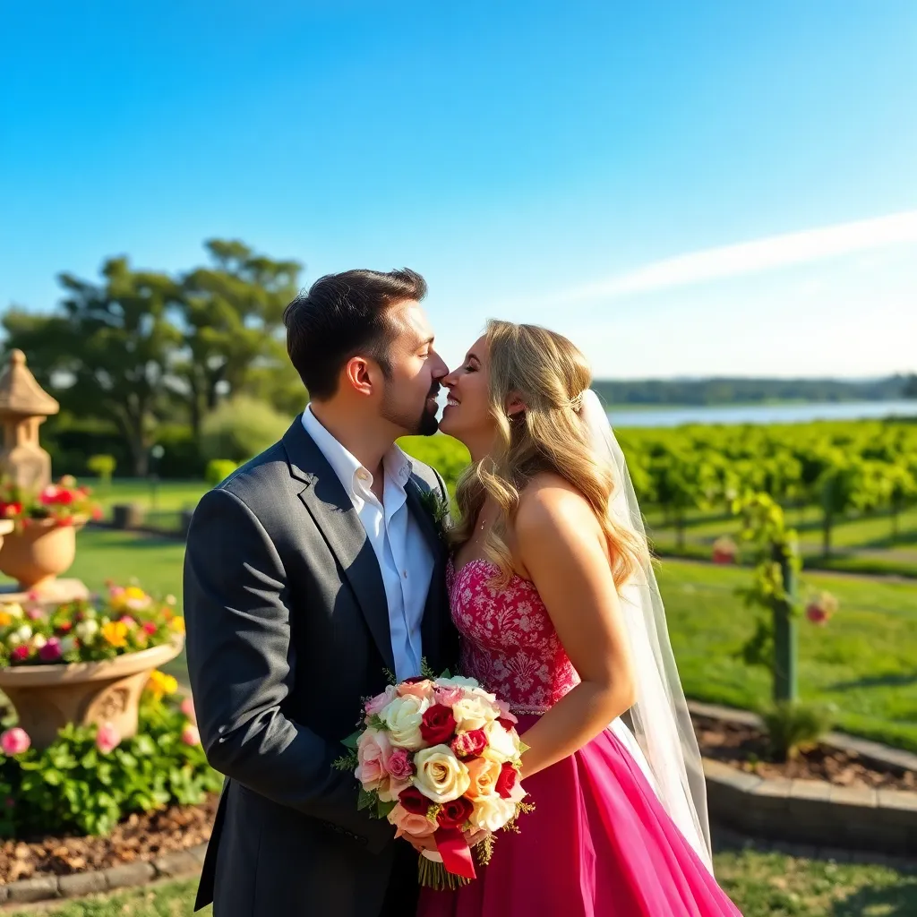 Capture the joy and love of the couple's special moment. Imagine a romantic outdoor setting with a beautiful garden, a serene lake, or a charming vineyard as the backdrop. The happy couple, dressed in elegant attire, share a tender kiss, laugh, and cherish each other's company. Create a dreamy scene!