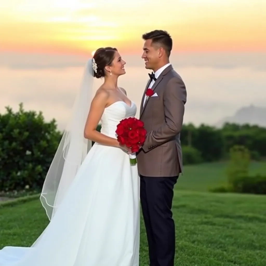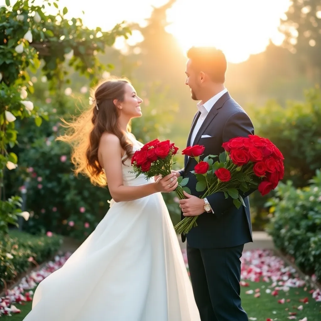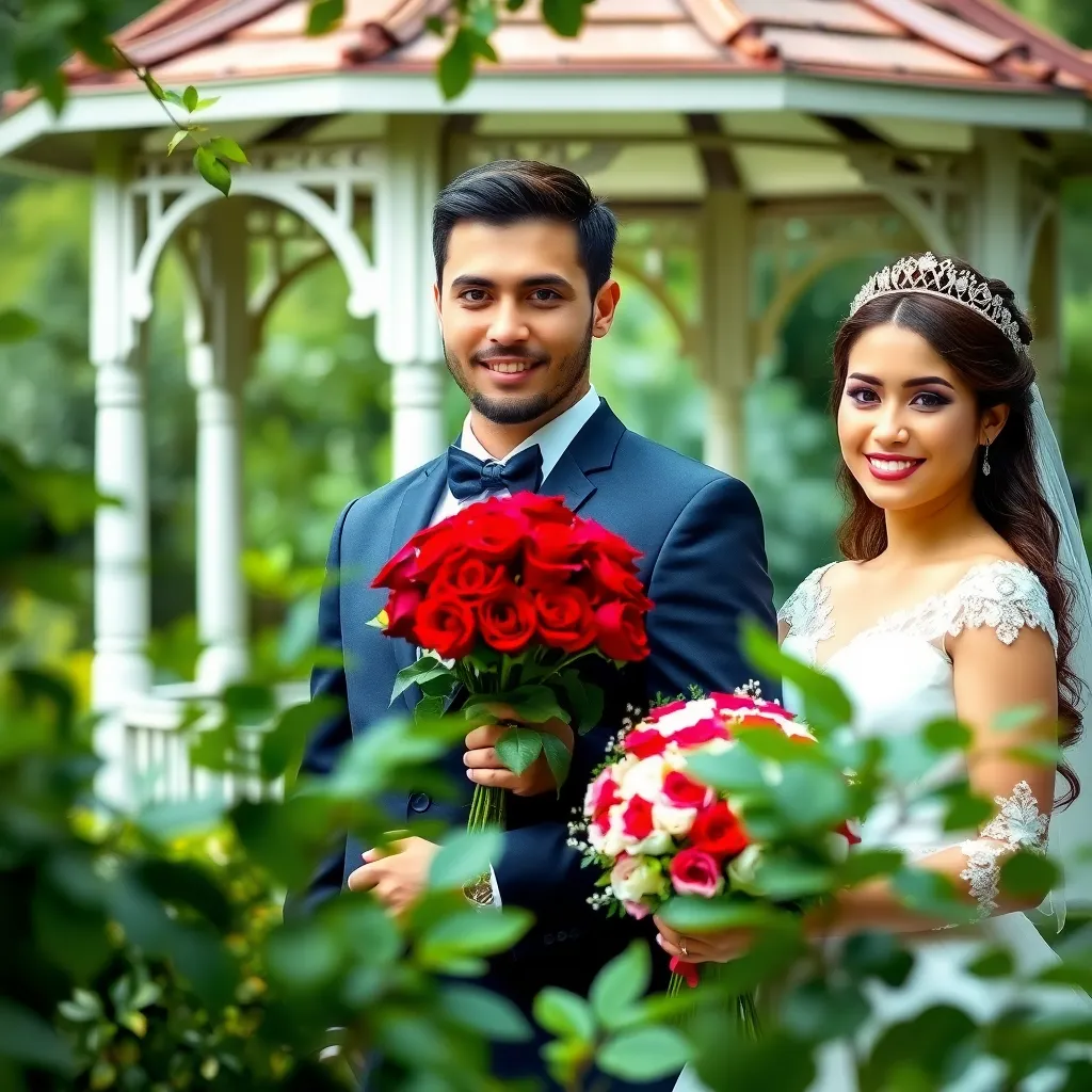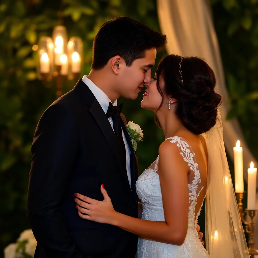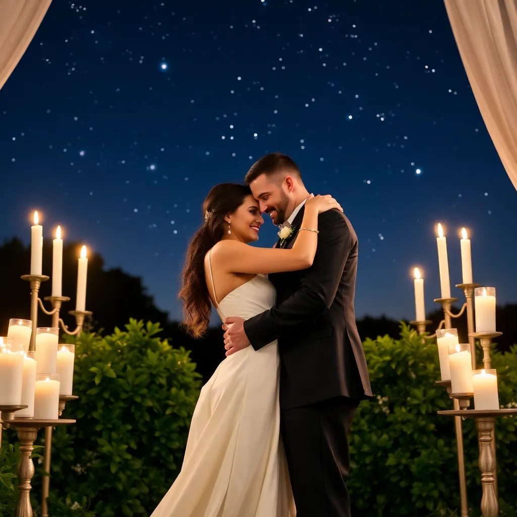 Capture the joy and love of the couple's special moment. Imagine a romantic outdoor setting with a beautiful garden, a serene lake, or a charming vineyard as the backdrop. The happy couple, dressed in elegant attire, share a tender kiss, laugh, and cherish each other's company. Create a dreamy scene!