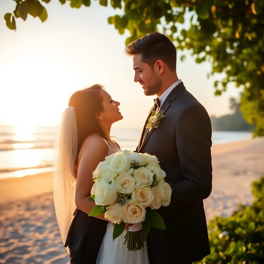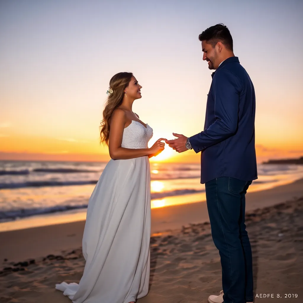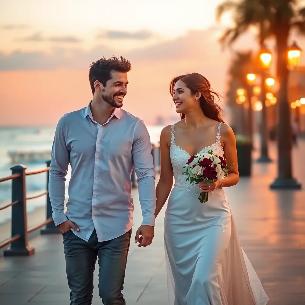 Capture the magic of pre-wedding bliss! Imagine a serene sunset on a beachside promenade, with the happy couple strolling hand-in-hand, laughing and whispering sweet nothings. The groom's rugged smile and the bride's radiant glow are illuminated by the warm golden light. Create an enchanting scene to commemorate their love.