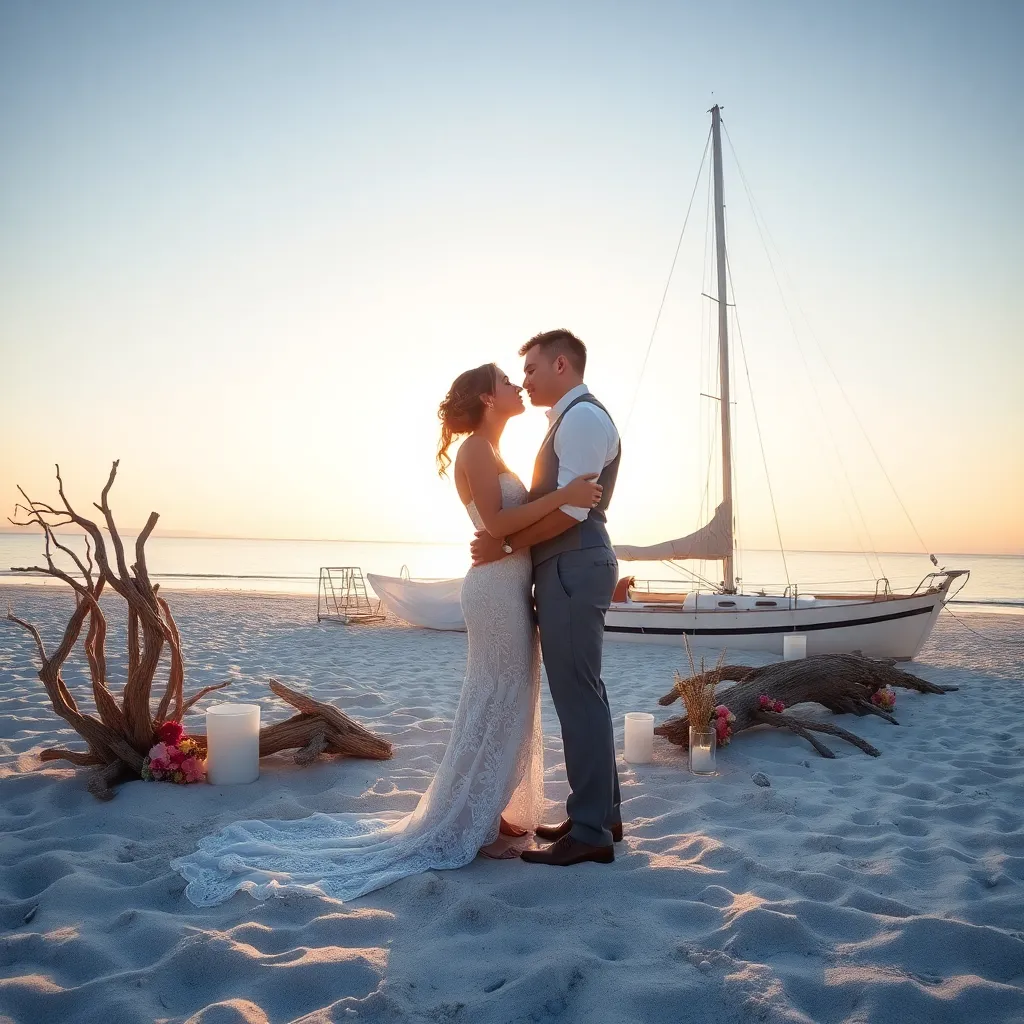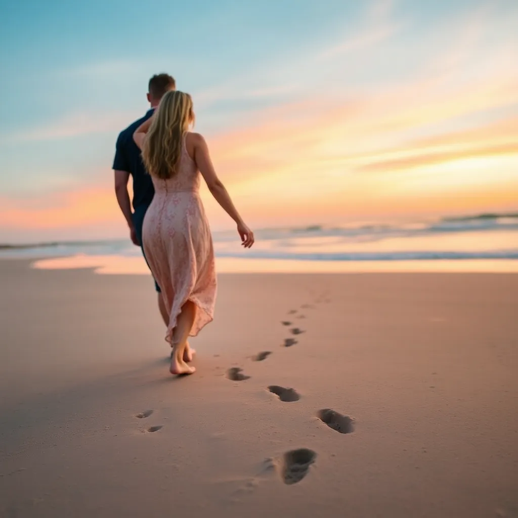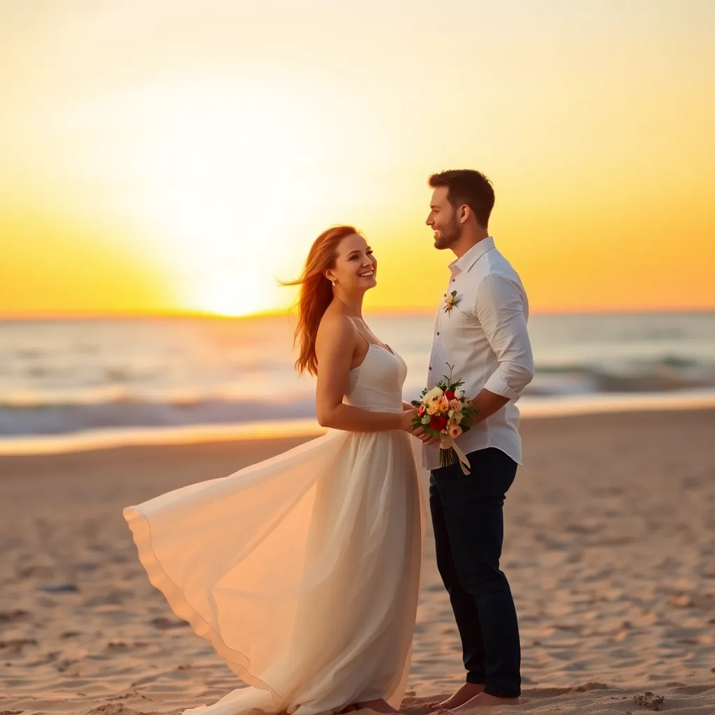 Capture the magic of pre-wedding bliss! Imagine a serene sunset on a beachside promenade, with the happy couple strolling hand-in-hand, laughing and whispering sweet nothings. The groom's rugged smile and the bride's radiant glow are illuminated by the warm golden light. Create an enchanting scene to commemorate their love.
