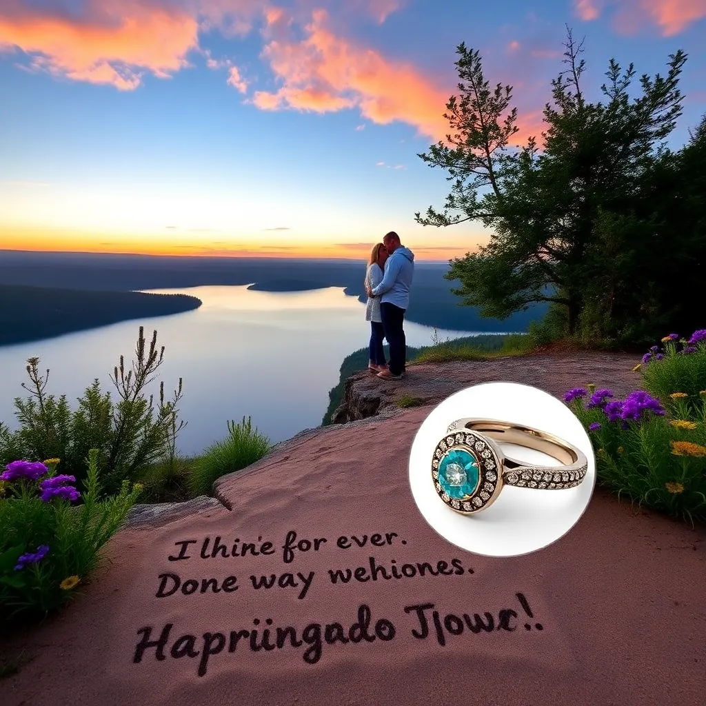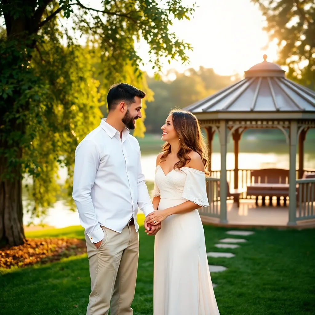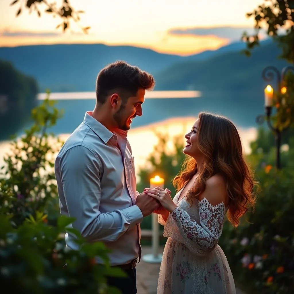 Capture the love and excitement of a pre-wedding engagement. Imagine a serene summer evening with a picturesque lake as the backdrop. The happy couple, dressed in casual yet elegant attire, share a romantic moment as they gaze into each other's eyes, surrounded by lush greenery and twinkling lights.