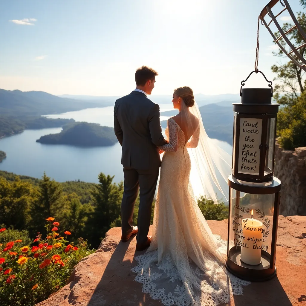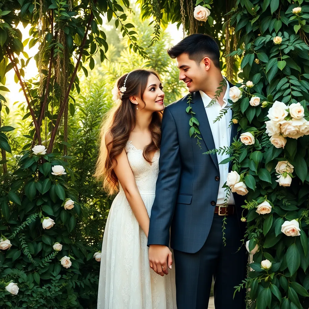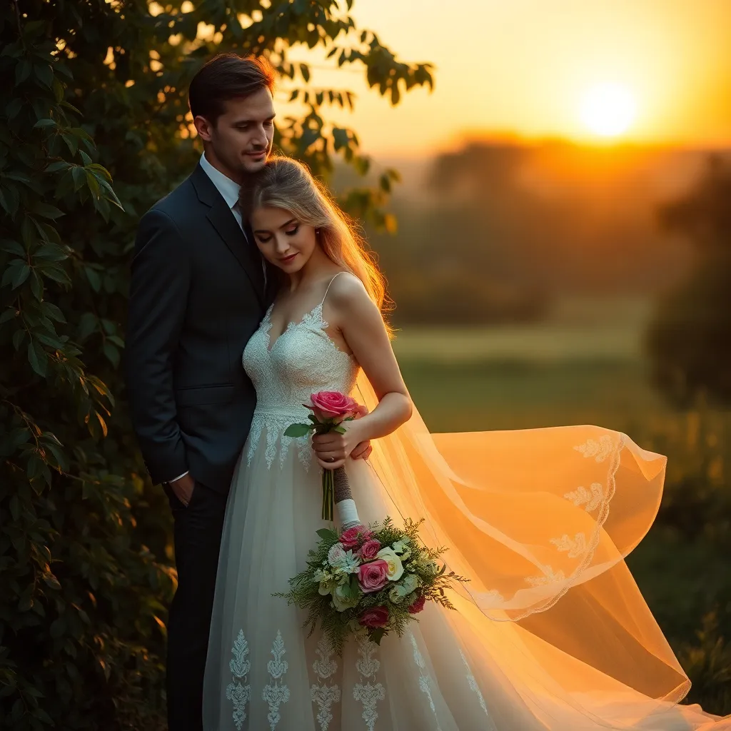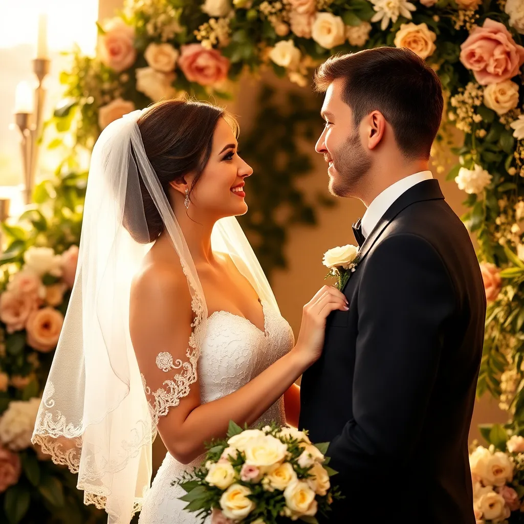 Capture the joy and love of the happy couple as they prepare to tie the knot. Imagine a warm, golden-lit scene with the bride and groom-to-be surrounded by lush greenery, vintage flowers, and soft, romantic lighting. The bride's lace veil gently falls down her back as she gazes lovingly at her fiancé.