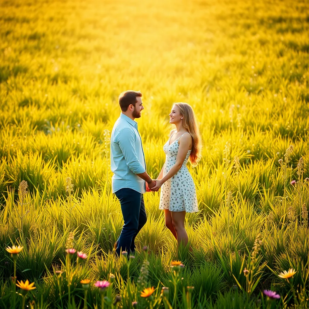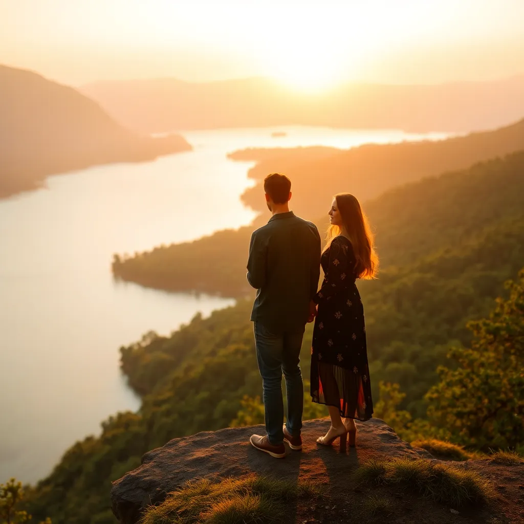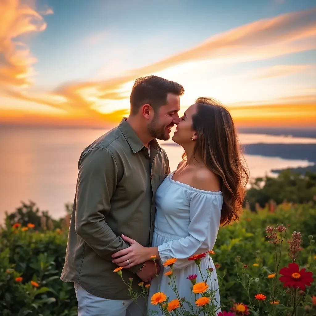 Create an intimate and romantic scene for a couple's pre-wedding engagement. The setting sun casts a warm glow on a serene lake shore, where the happy couple shares a tender moment amidst lush greenery and vibrant flowers. Capture the love, joy, and anticipation of this special moment in their journey together.