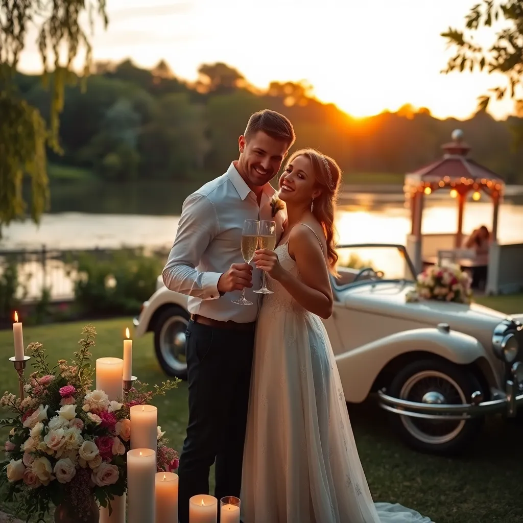 Capture the joy and love as [Bride's Name] and [Groom's Name] celebrate their pre-wedding engagement in a picturesque outdoor setting. Imagine a serene lake, lush greenery, and a warm sunset glow. The couple is surrounded by candles, flowers, and champagne, with a vintage car and a romantic gazebo in the background.