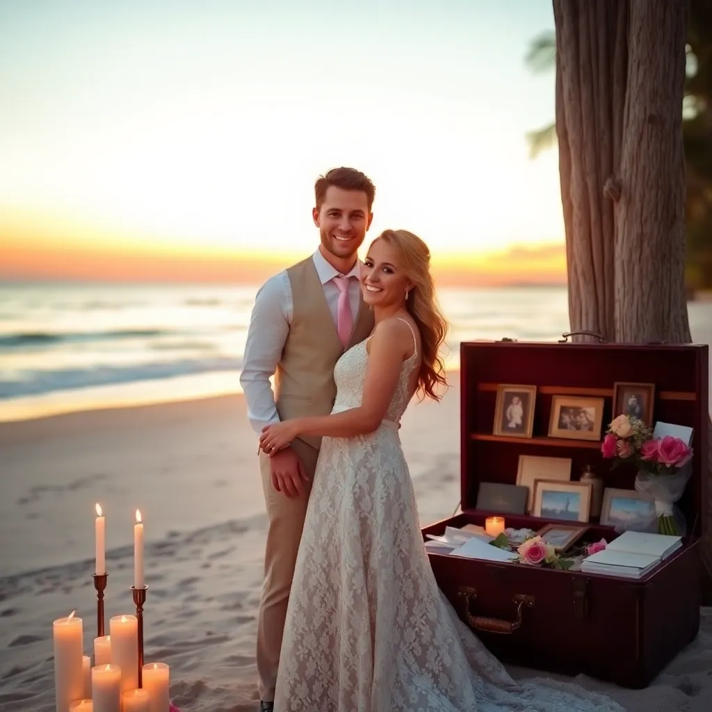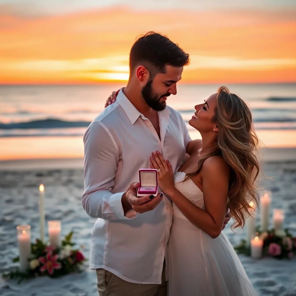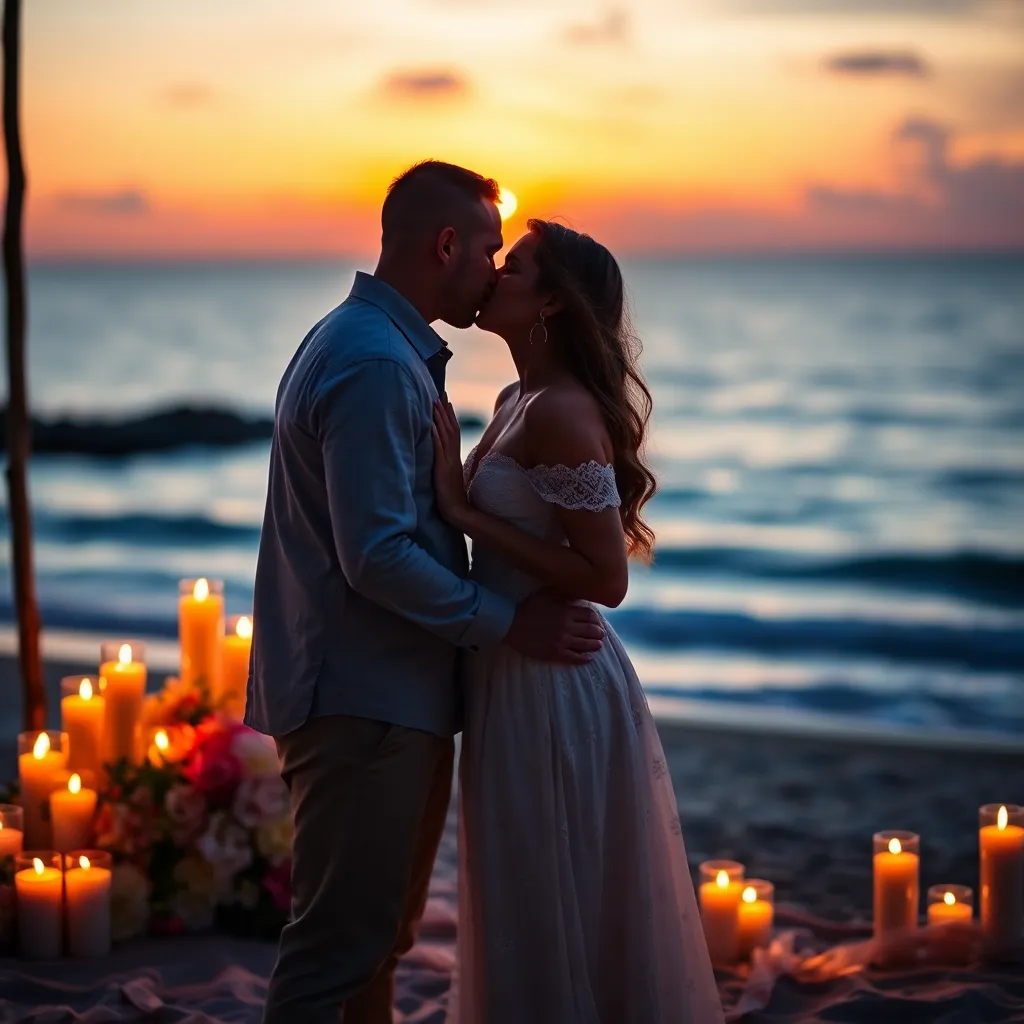 Create a romantic and intimate pre-wedding engagement scene. Capture the couple's special moment as they share a tender kiss on a sunset-lit beach, surrounded by candles, flowers, and a breathtaking ocean view. Incorporate soft, warm lighting and a subtle glow to convey the magic and romance of the occasion.