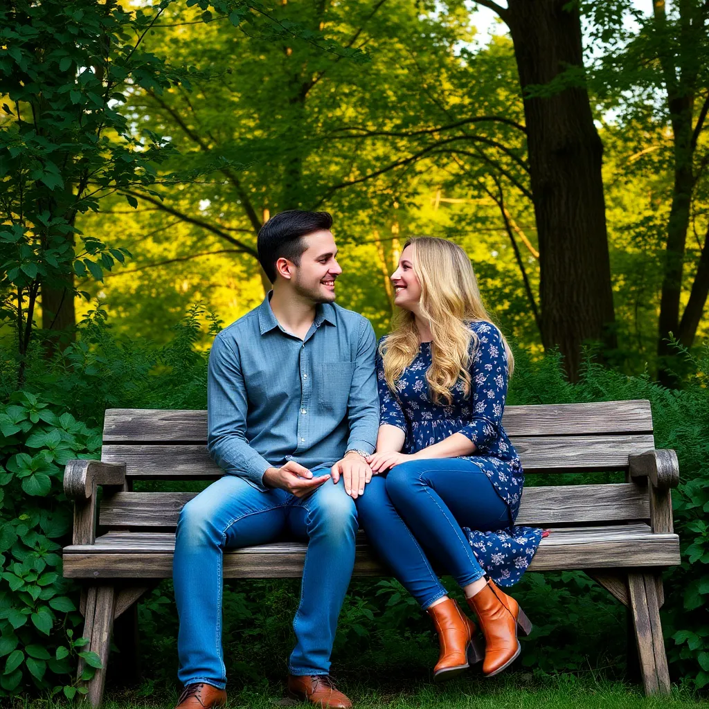Create an intimate, whimsical scene for a pre-wedding engagement shoot. The couple, surrounded by lush greenery, sit on a rustic wooden bench, hands entwined, gazing lovingly into each other's eyes. Soft golden light filters through the trees, casting a warm glow on their joyful, relaxed expressions.
