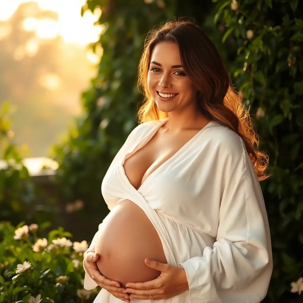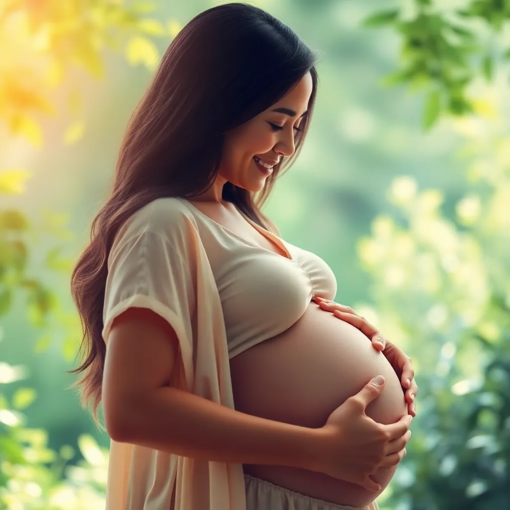 Create an AI-generated image of a serene expectant mother, cradling her growing belly, surrounded by soft petals and gentle lighting. Incorporate a subtle smile and warm colors to convey a sense of joy and serenity. The image should evoke feelings of peace and tranquility, capturing the beauty of pregnancy.