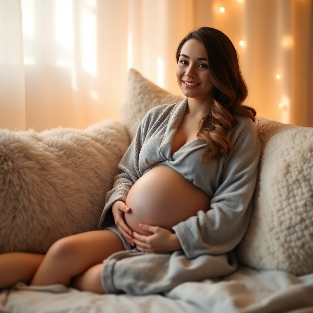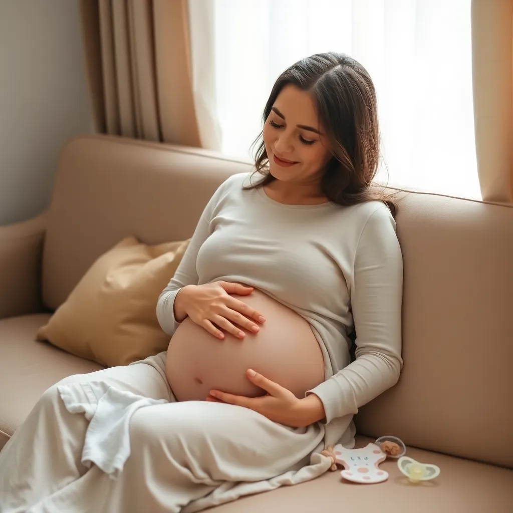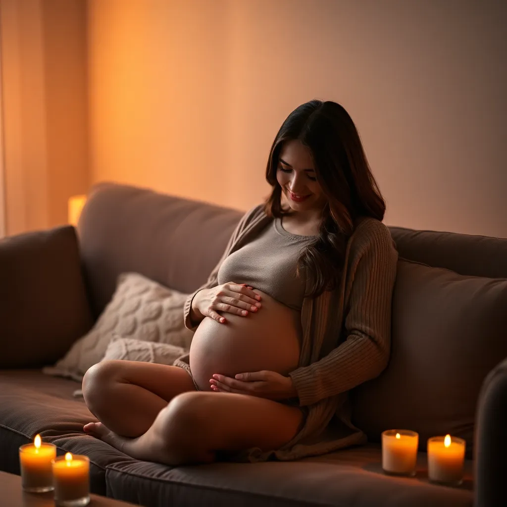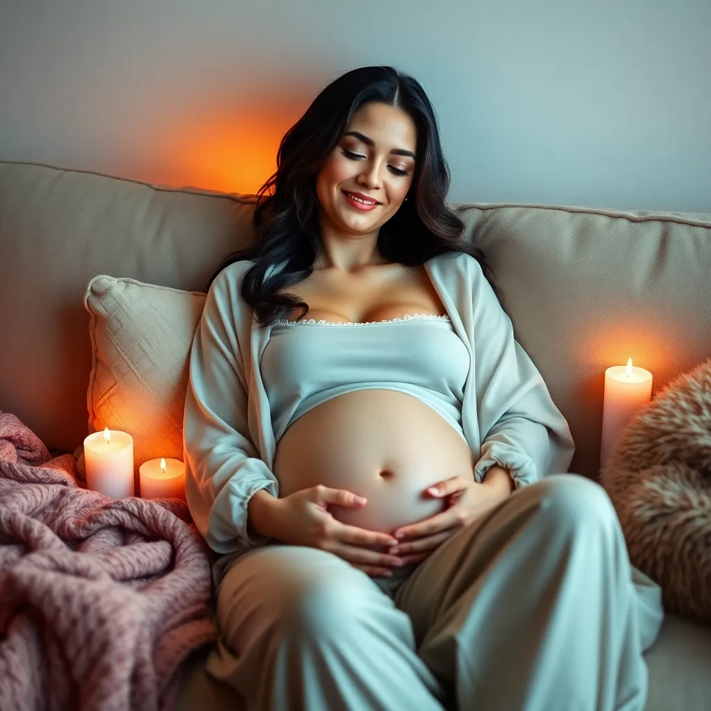 Create an image of a serene and expectant mother, surrounded by soft lighting and calming colors. She's sitting on a plush couch, cradling her growing belly, with a gentle smile and closed eyes. Incorporate subtle hints of baby essentials, like a onesie and a pacifier, to complete the intimate scene.