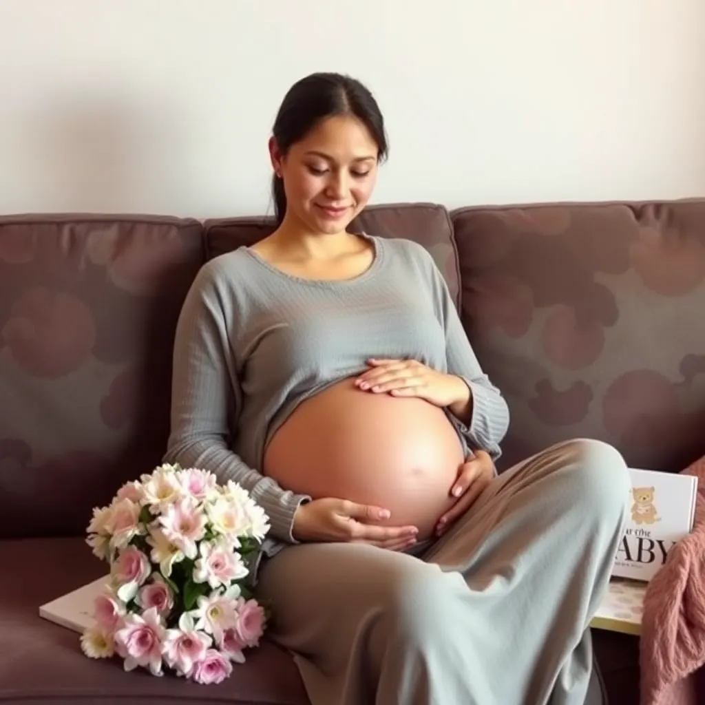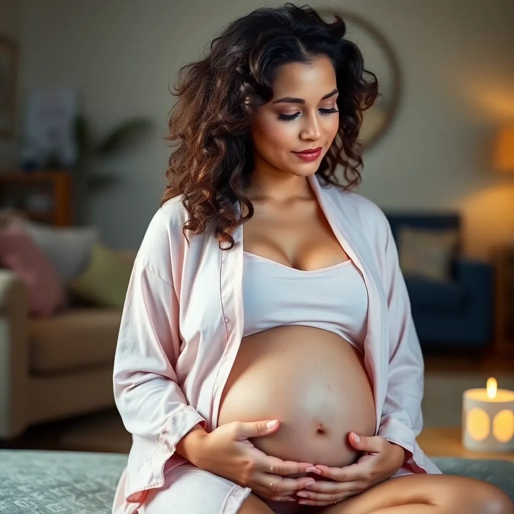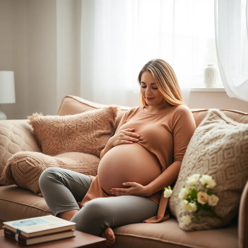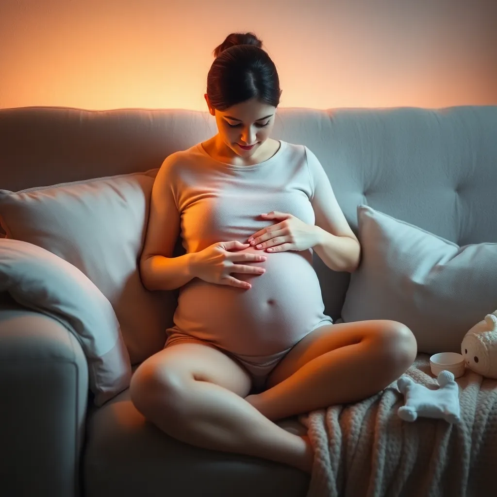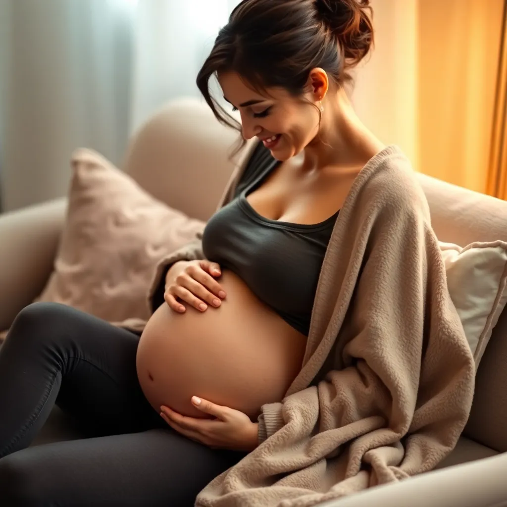 Create an image of a serene and expectant mother, surrounded by soft lighting and calming colors. She's sitting on a plush couch, cradling her growing belly, with a gentle smile and closed eyes. Incorporate subtle hints of baby essentials, like a onesie and a pacifier, to complete the intimate scene.