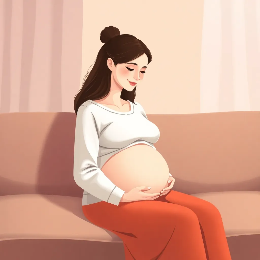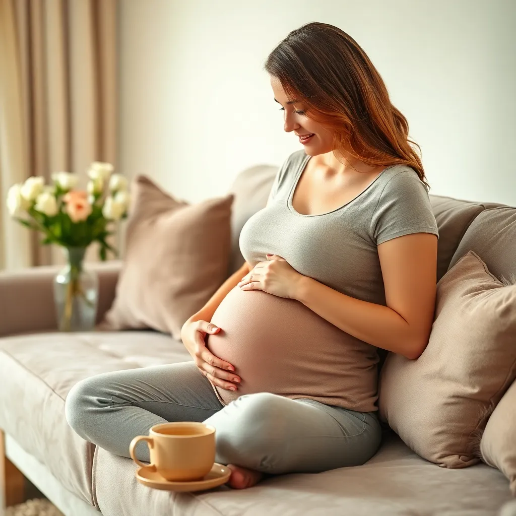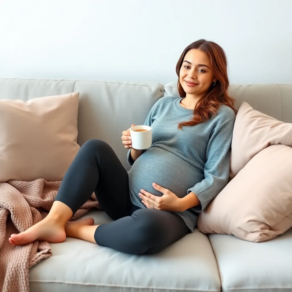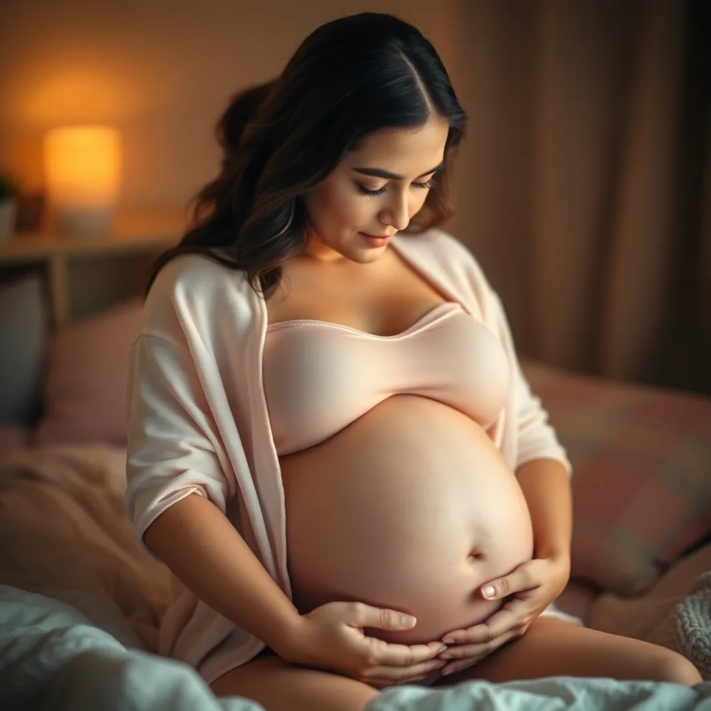 Create an image of a serene and expectant mother, surrounded by soft lighting and calming colors. She's sitting on a plush couch, cradling her growing belly, with a gentle smile and closed eyes. Incorporate subtle hints of baby essentials, like a onesie and a pacifier, to complete the intimate scene.