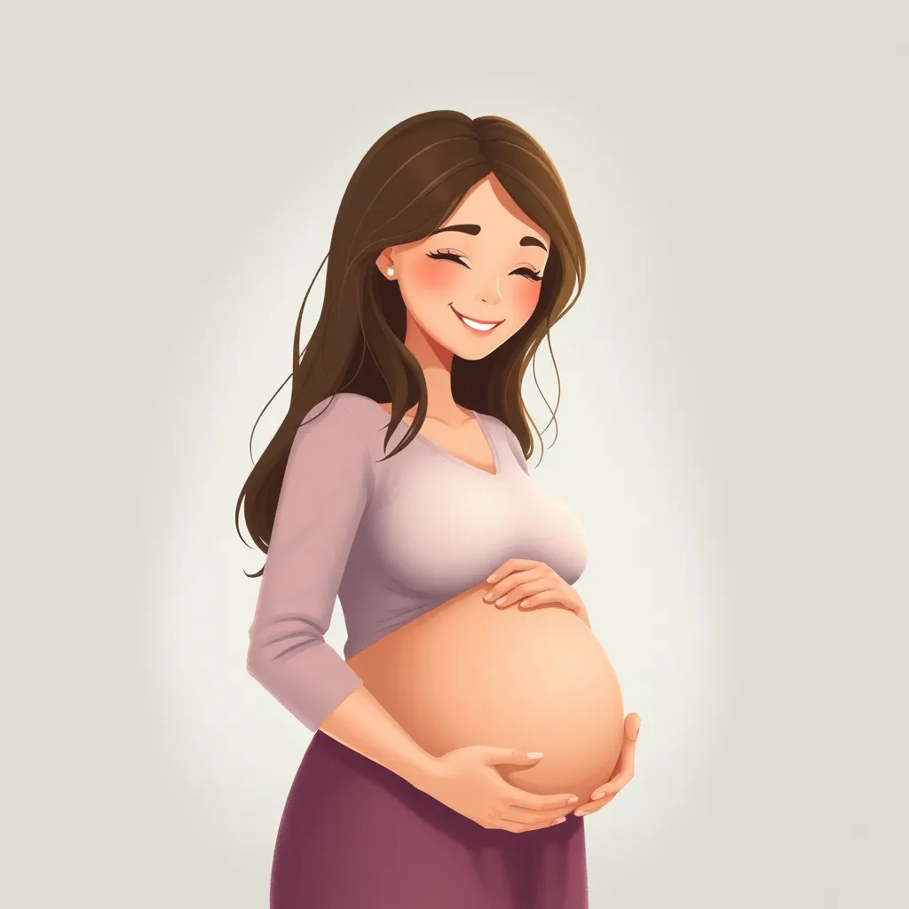 Create an illustration of a happy, expecting mother-to-be, with a warm and gentle smile, cradling her growing belly. Incorporate soft, calming colors and textures, with a subtle glow to convey the joy and serenity of this special moment. The mother's face should be the main focus, with the baby bump subtly emphasized.
