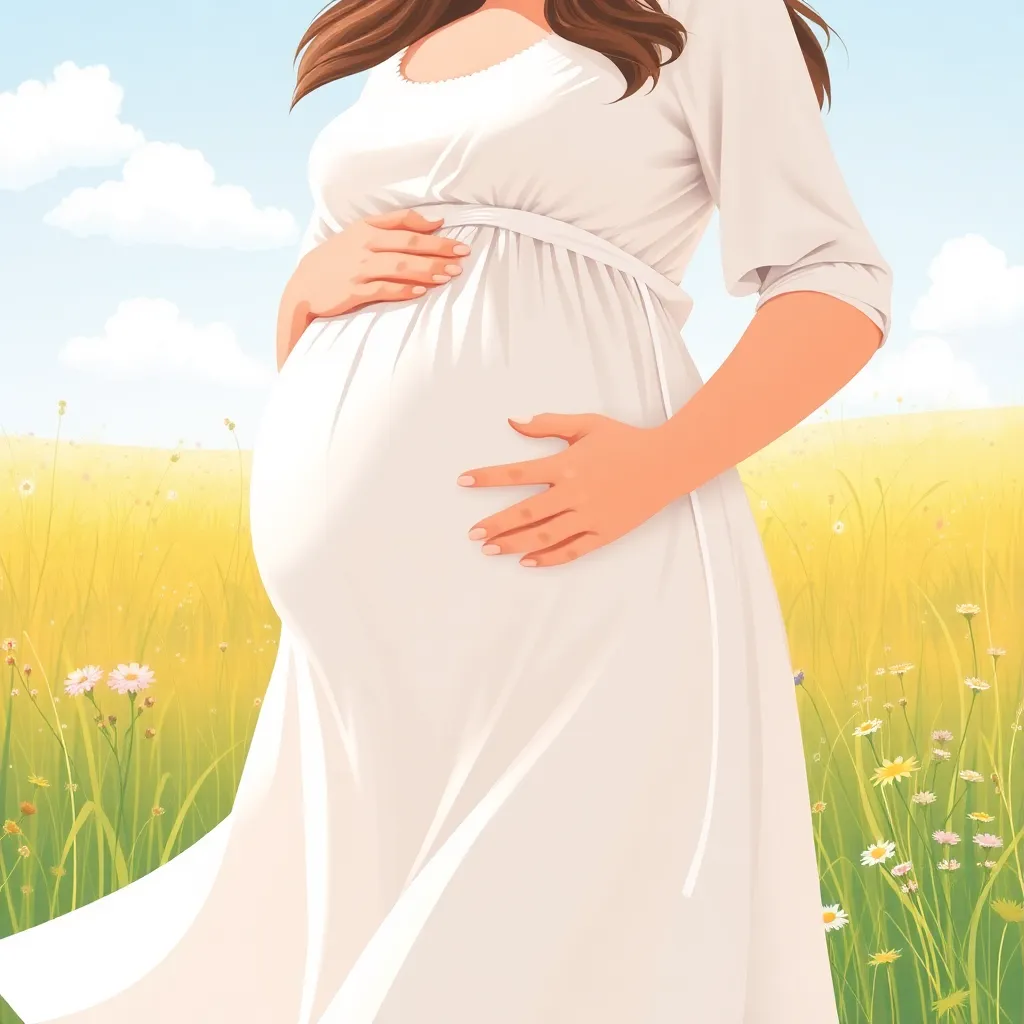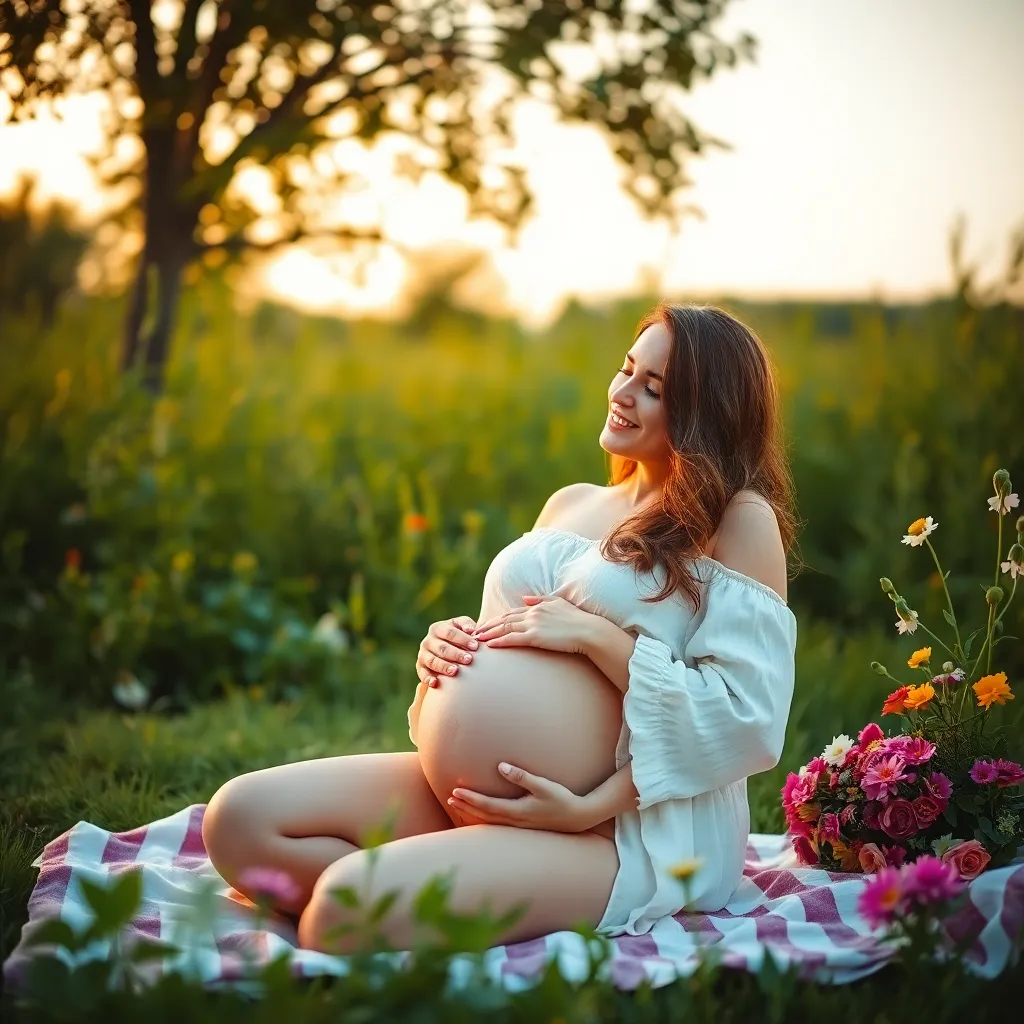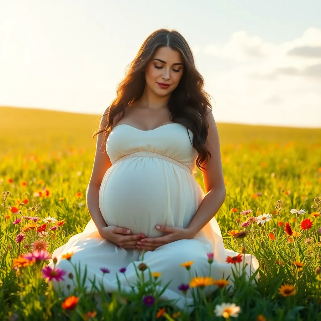 Create an AI-generated image of a serene pregnant woman sitting in a lush green meadow, surrounded by vibrant wildflowers and a warm sunlight. Her belly is gently rounded, and she's wearing a flowing white dress with a soft, golden glow. The atmosphere is peaceful, with a few gentle clouds in the sky.