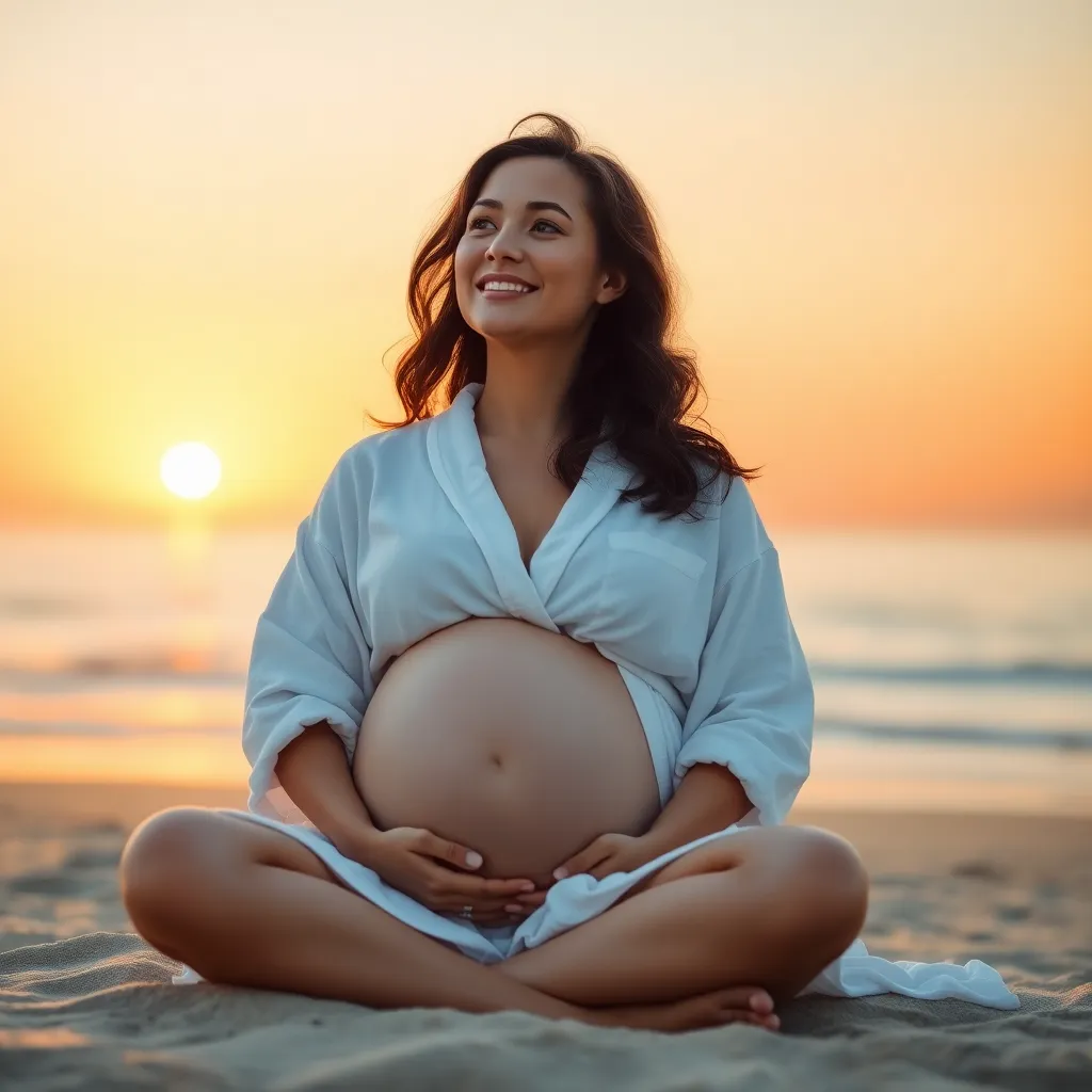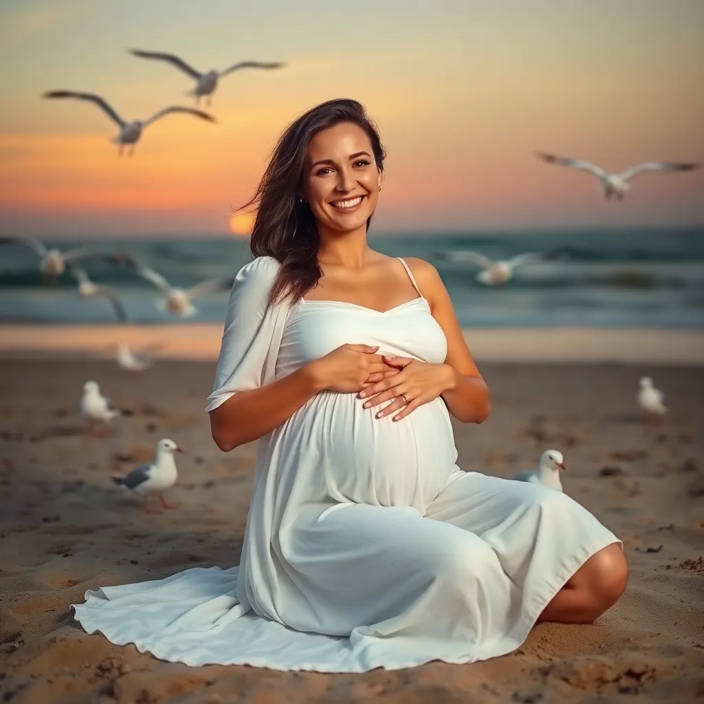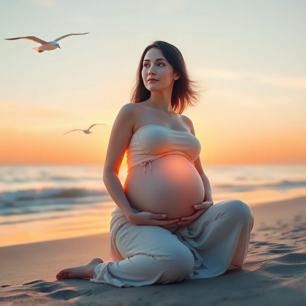 Create an AI-generated image of a serene expectant mother sitting on a peaceful beach at sunset, with a calm expression and a subtle glow around her belly. Incorporate soothing colors and natural elements, such as seagulls flying overhead and waves gently lapping at the shore, to evoke a sense of tranquility.