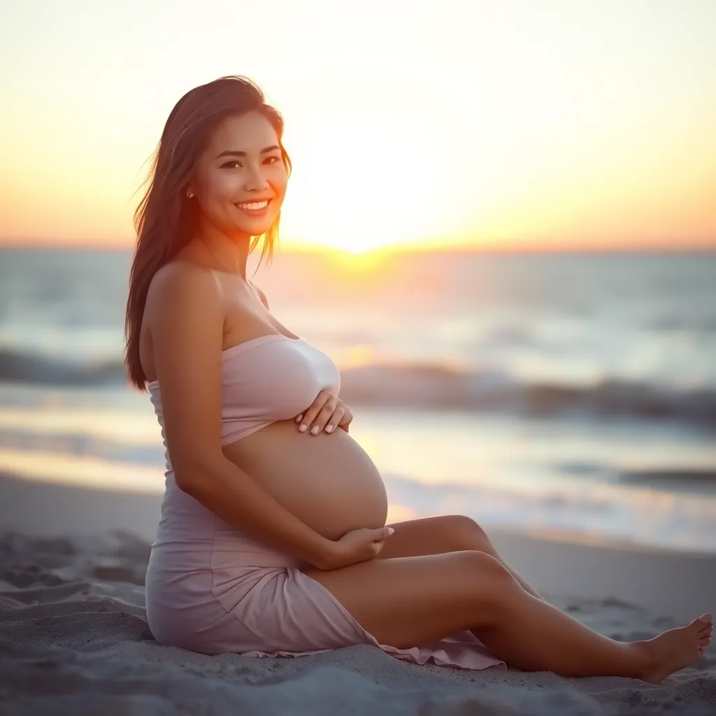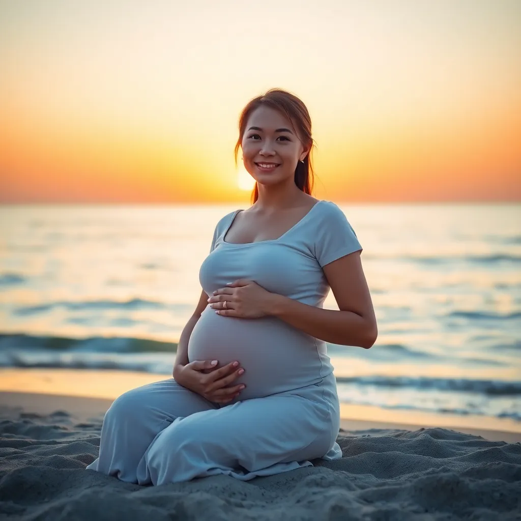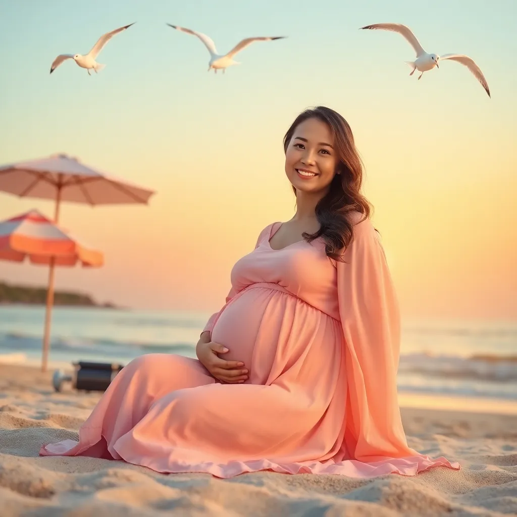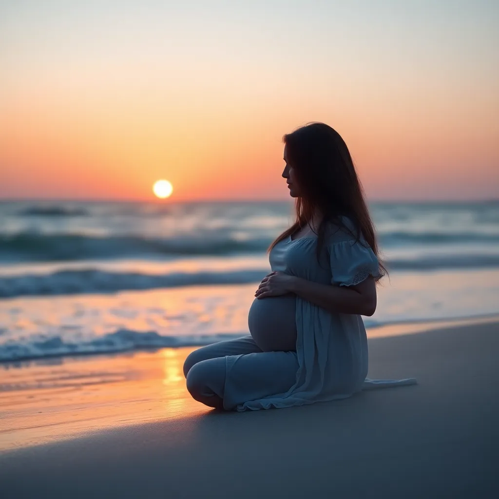 Create an AI-generated image of a serene expectant mother sitting on a peaceful beach at sunset, with a calm expression and a subtle glow around her belly. Incorporate soothing colors and natural elements, such as seagulls flying overhead and waves gently lapping at the shore, to evoke a sense of tranquility.